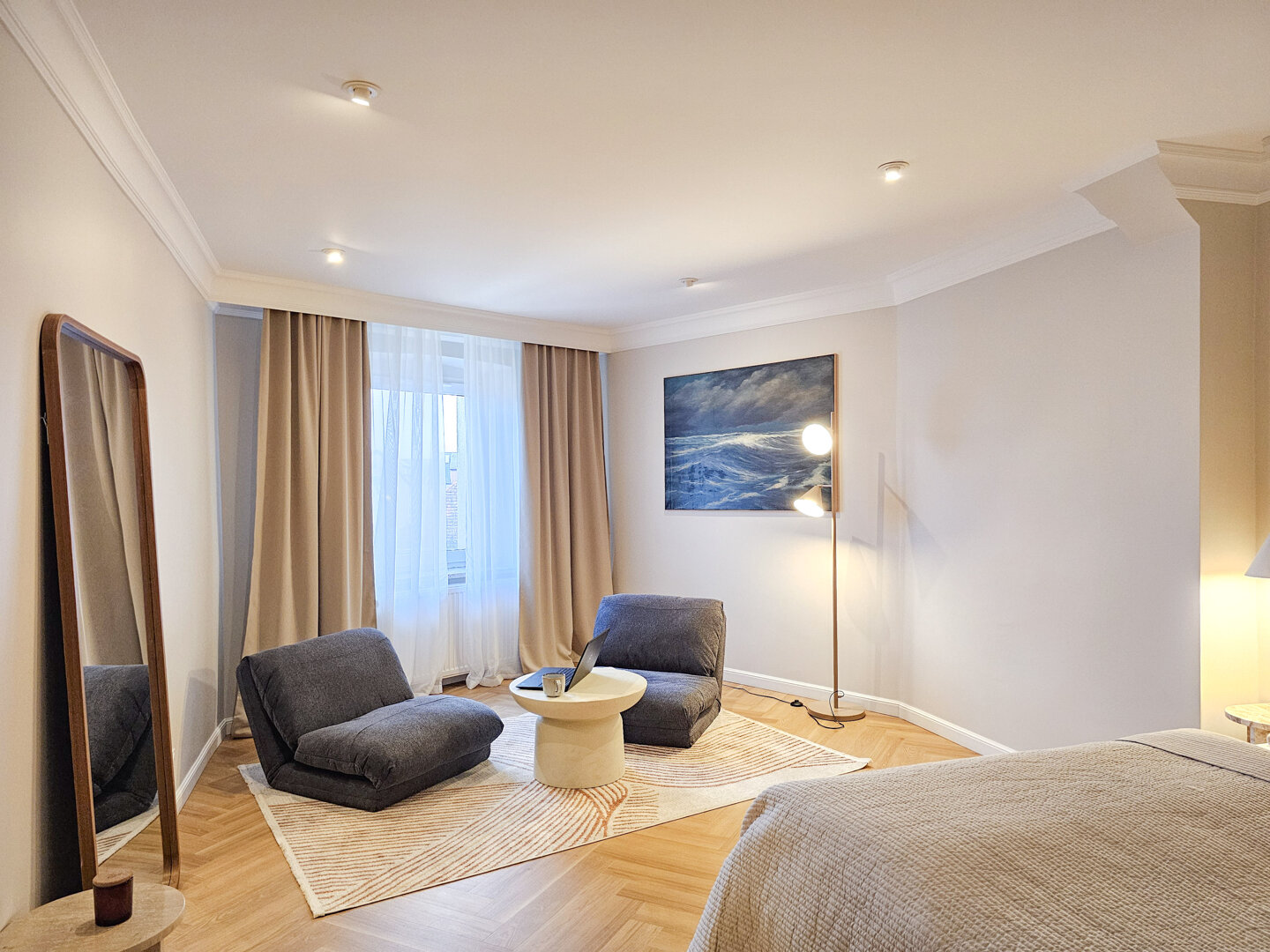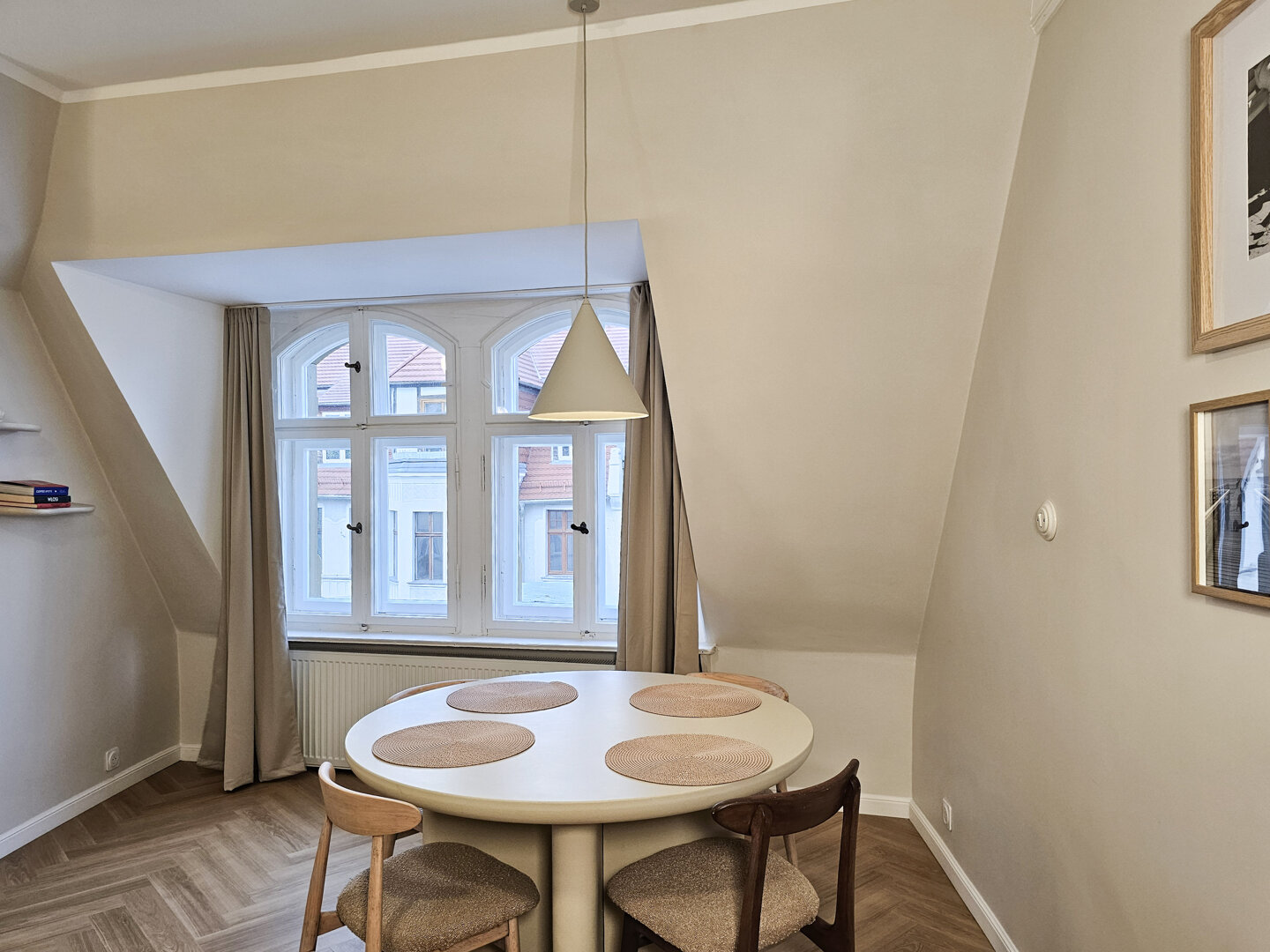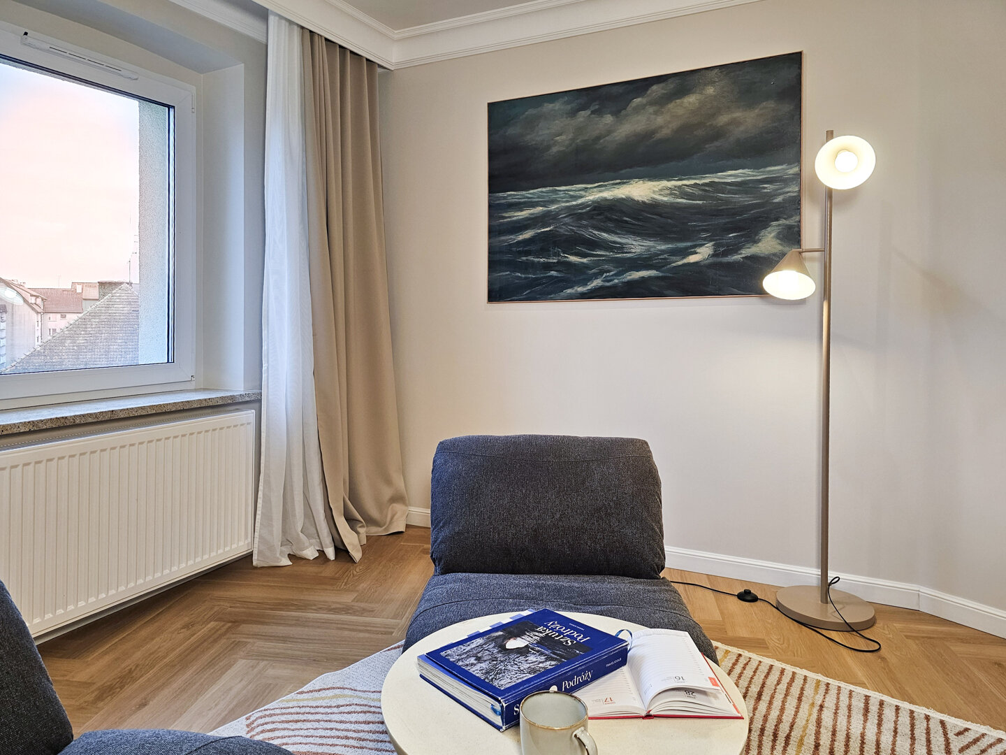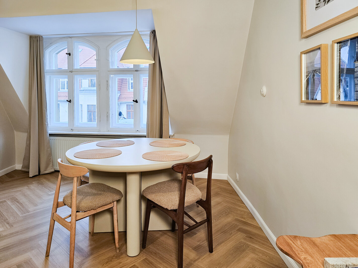 This cozy one-bedroom apartment is located on the fourth floor (no elevator) of an atmospheric, historic building in the city center. The apartment is distinguished by its bright, pleasant space and functional layout.