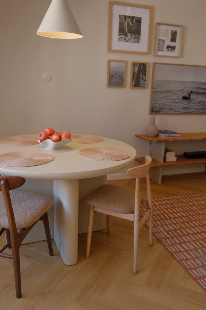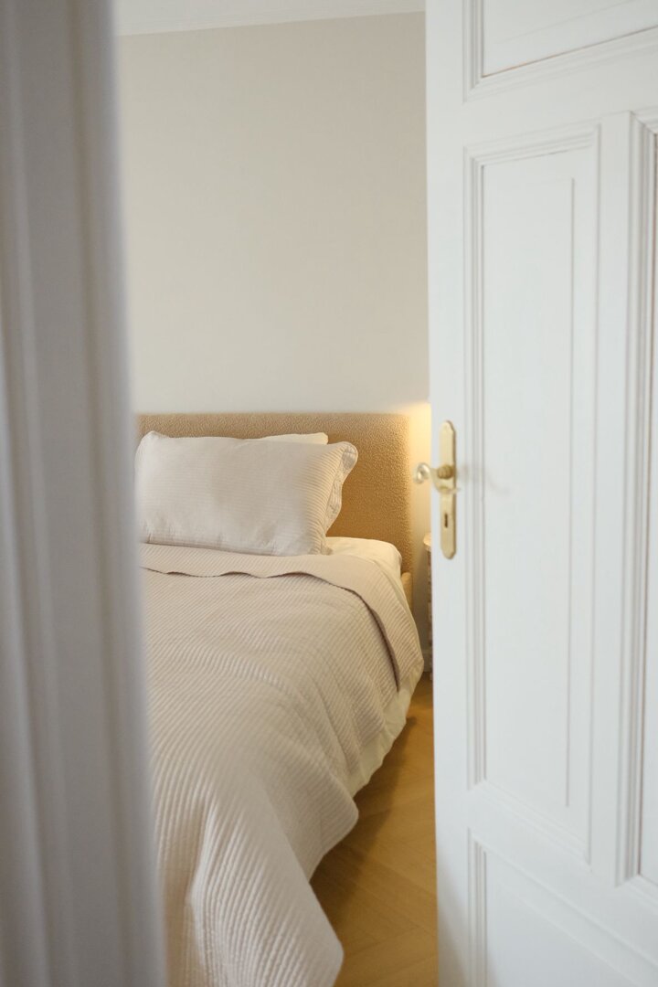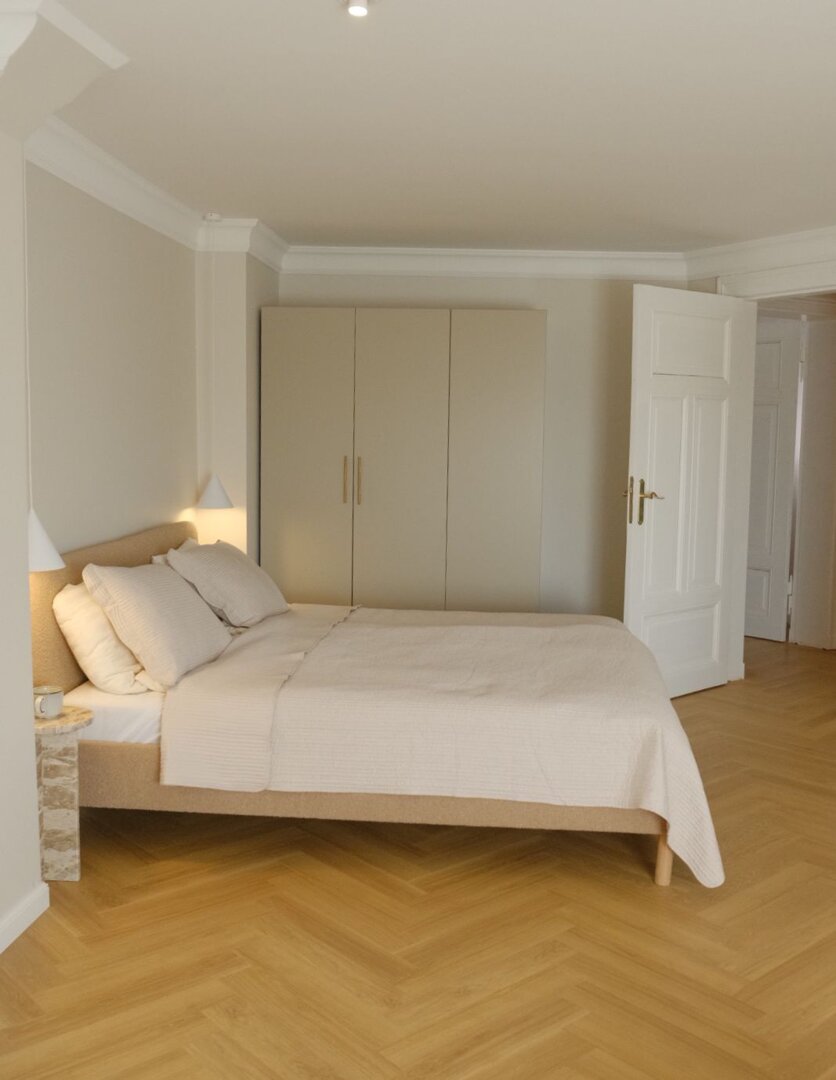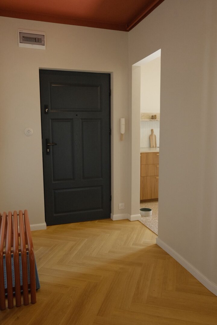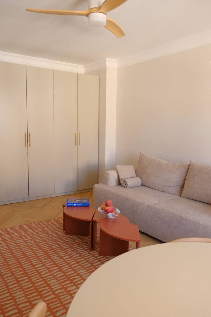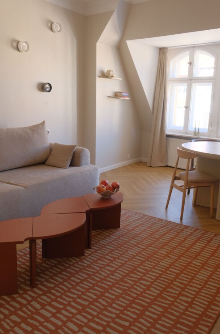 A spacious and stylish apartment with one bedroom, a living room, a kitchen, and a bathroom, located in a historic tenement house dating back to the turn of the 19th and 20th centuries. It is situated on the 4th floor, accessible only by stairs. The apartment stands out for its bright, minimalist, well-designed, and functional space.