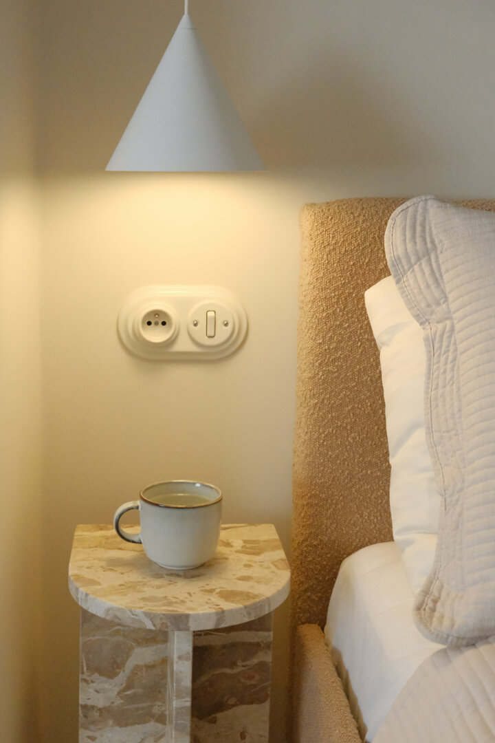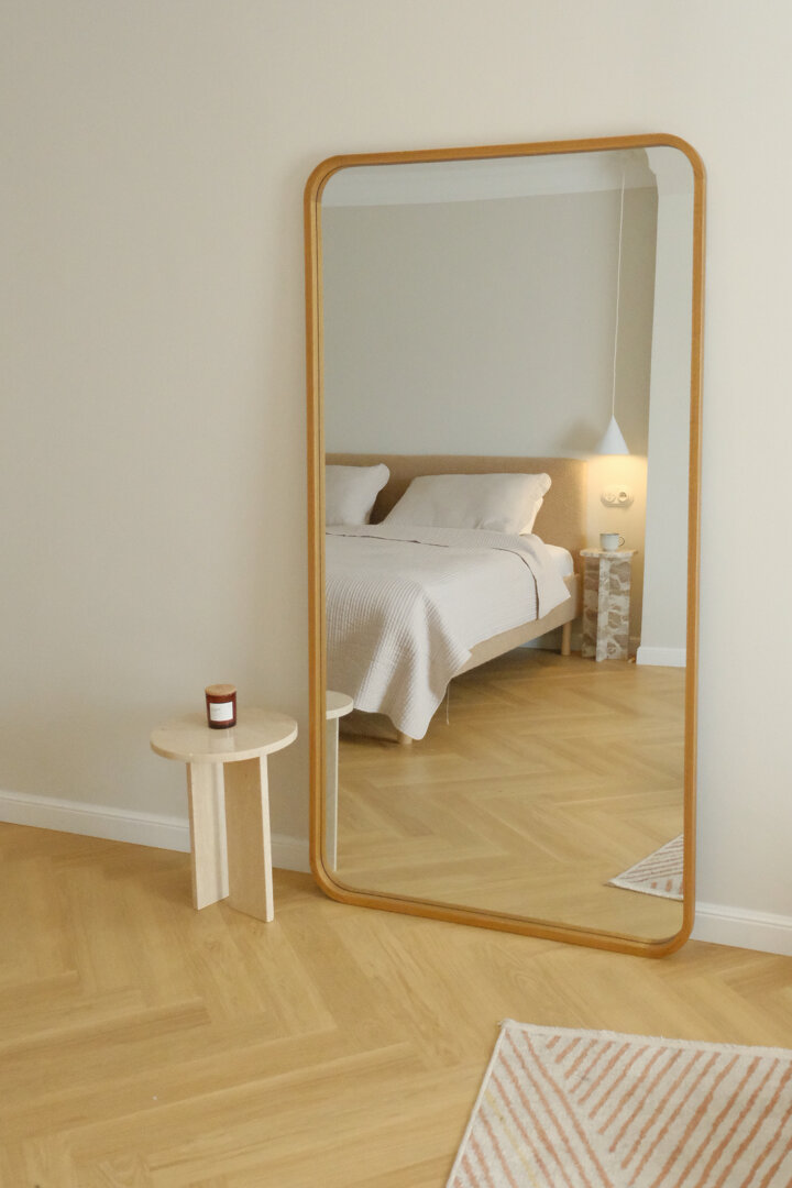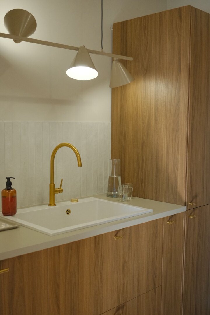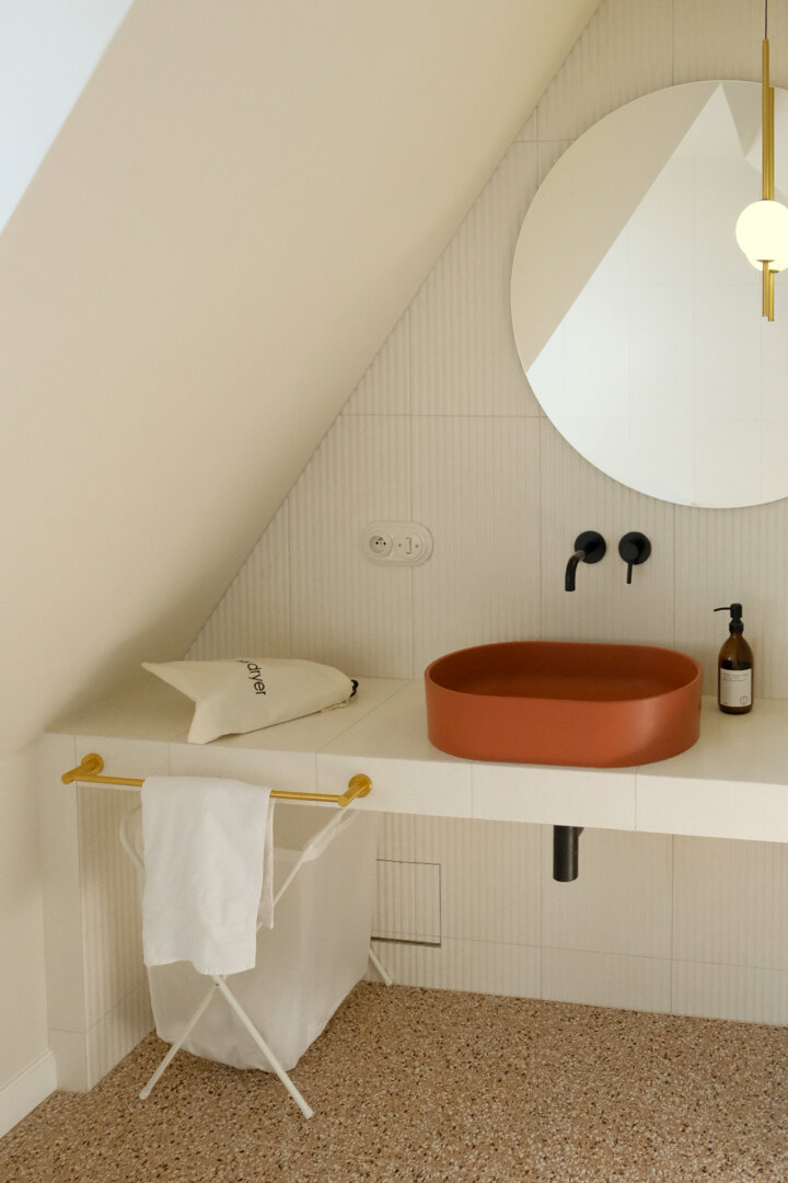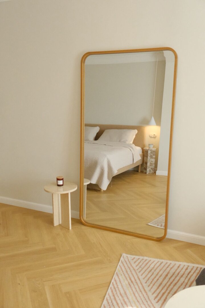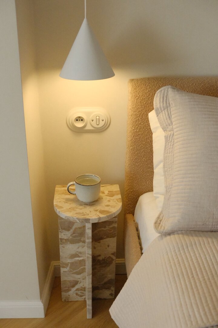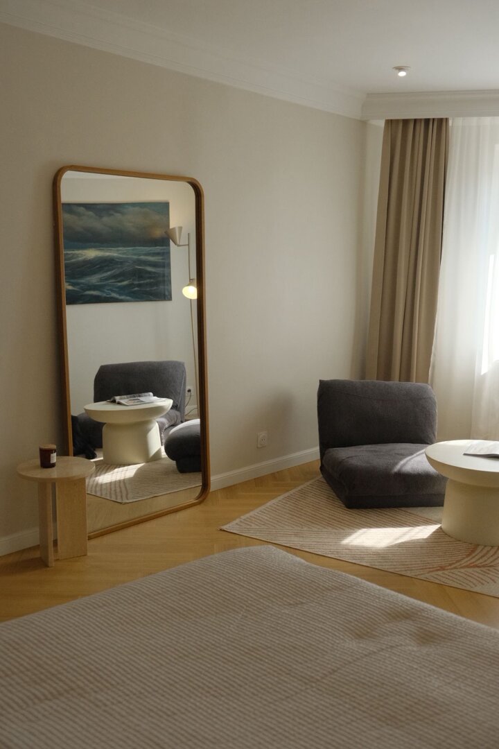 A spacious and stylish apartment with one bedroom, a living room, a kitchen, and a bathroom, located in a historic tenement house dating back to the turn of the 19th and 20th centuries. It is situated on the 4th floor, accessible only by stairs. The apartment stands out for its bright, minimalist, well-designed, and functional space.