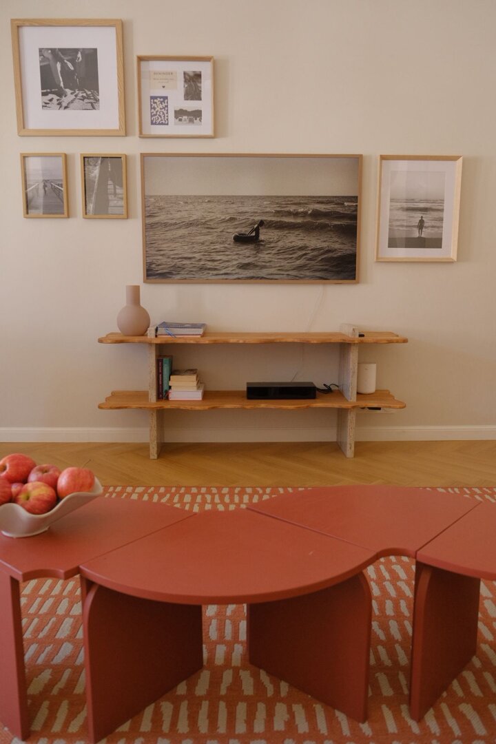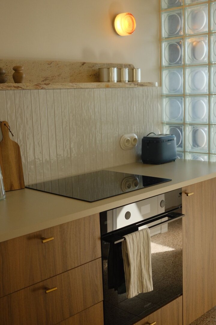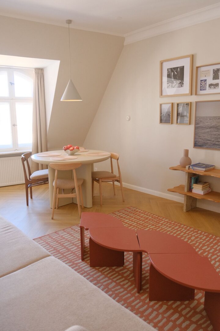 Stylish 80m² apartment on the second floor of a building without an elevator. Spacious living room with kitchenette and access to the south-facing balcony.