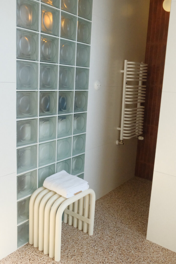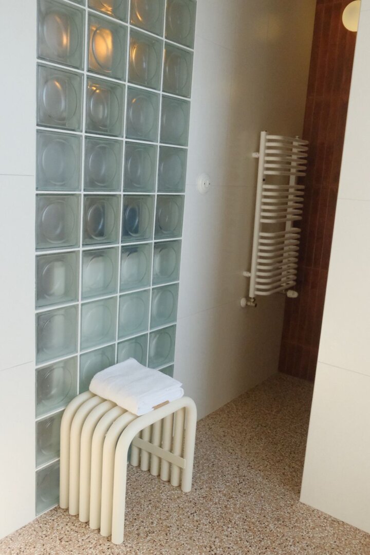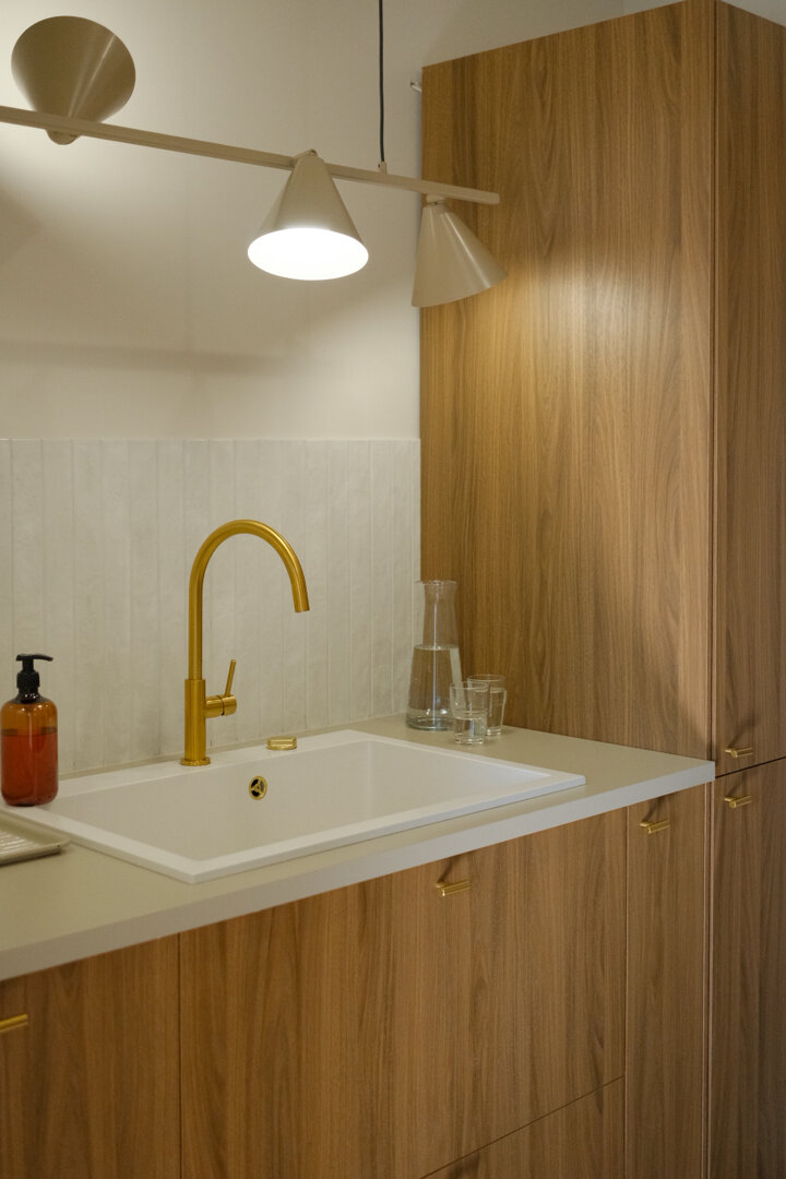 The bathroom, accessed through the kitchen, offers guests a sink, a washing machine, and a spacious shower cabin.