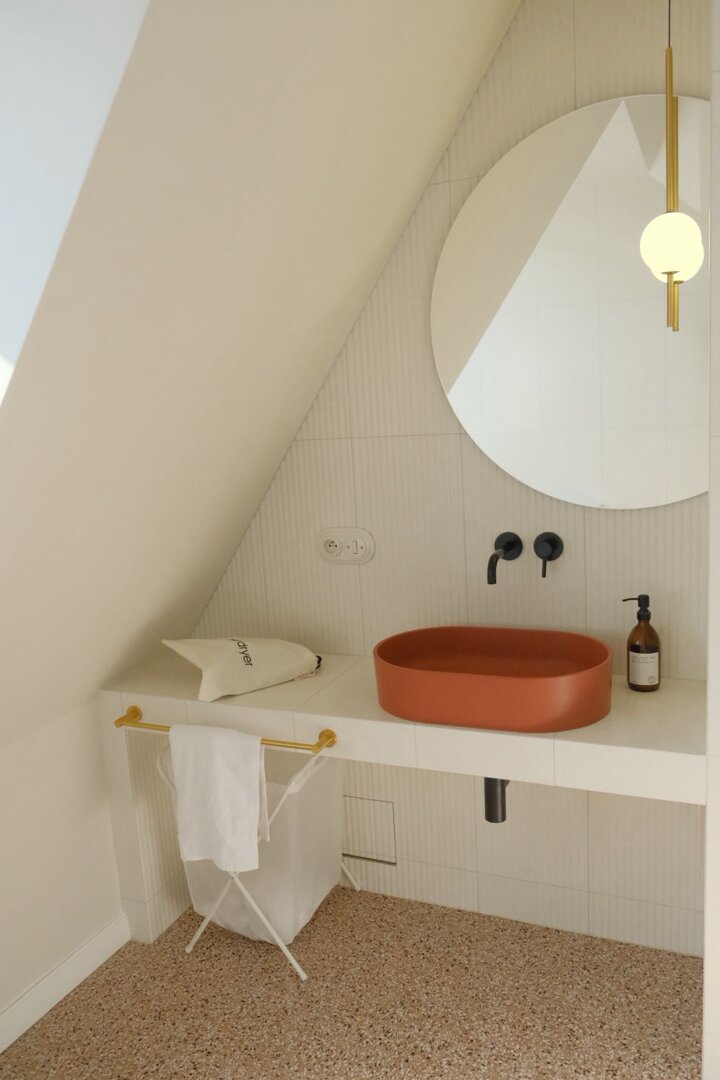 A tastefully furnished, two-storey loft apartment. The top floor comprises a romantic bedroom (with a double bed), while on the bottom floor you will find a living room with a kitchenette and a double sofa bed, a bathroom with a bath tub, and a balcony to