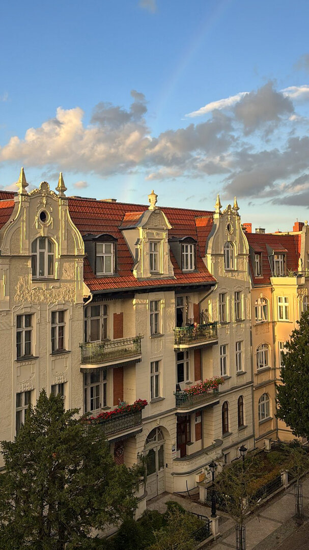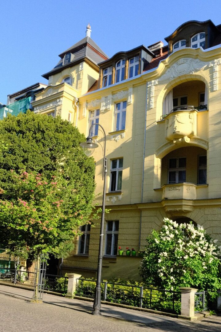 The apartment is located on a quiet city street with limited car traffic. The area is characterized by historic buildings under the protection of the conservator of monuments.