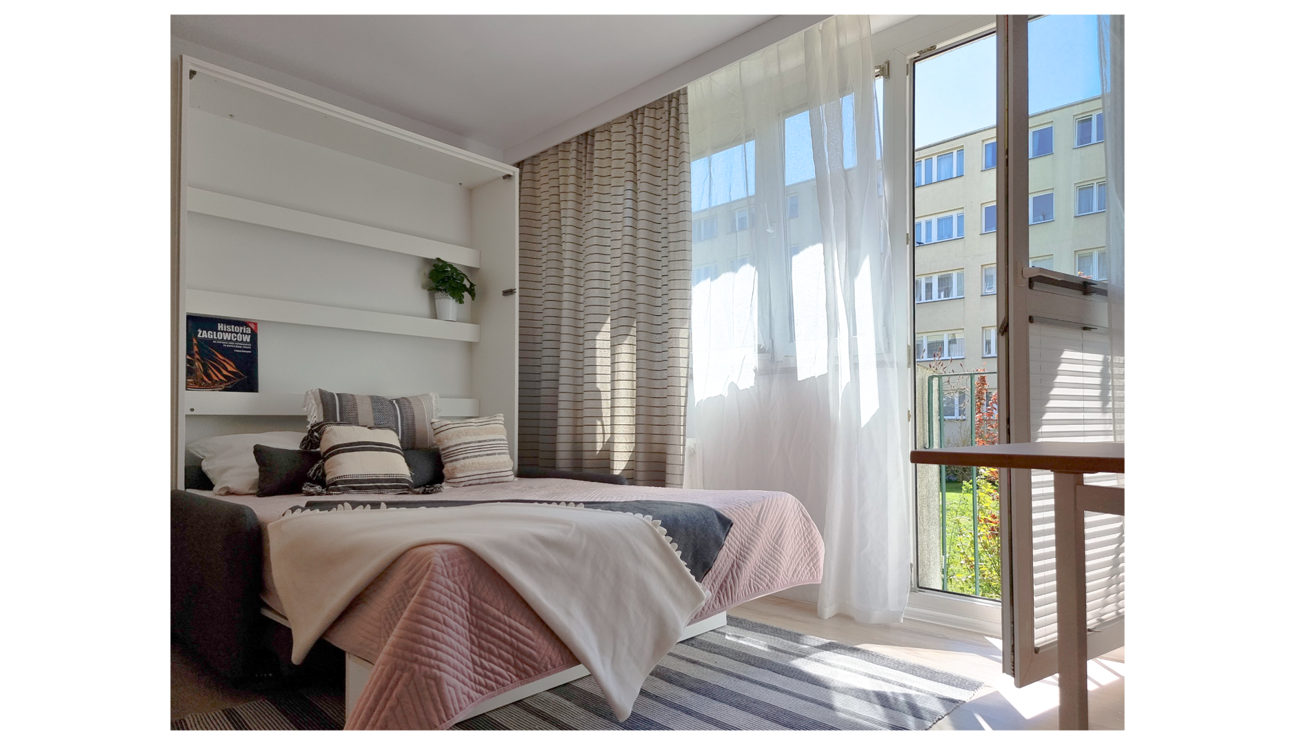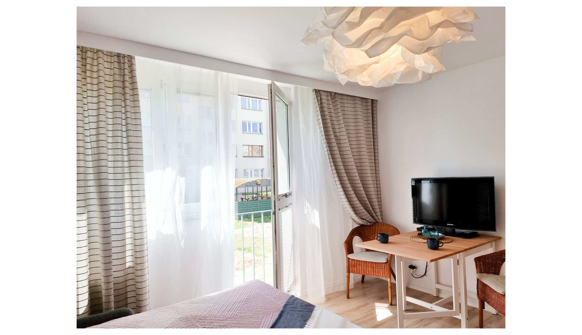 Cozy studio apartment with balcony in Świnoujście, just steps from the beach, promenade, and spa park. Perfect for a relaxing stay. Free WiFi, TV, kitchenette, pet-friendly.