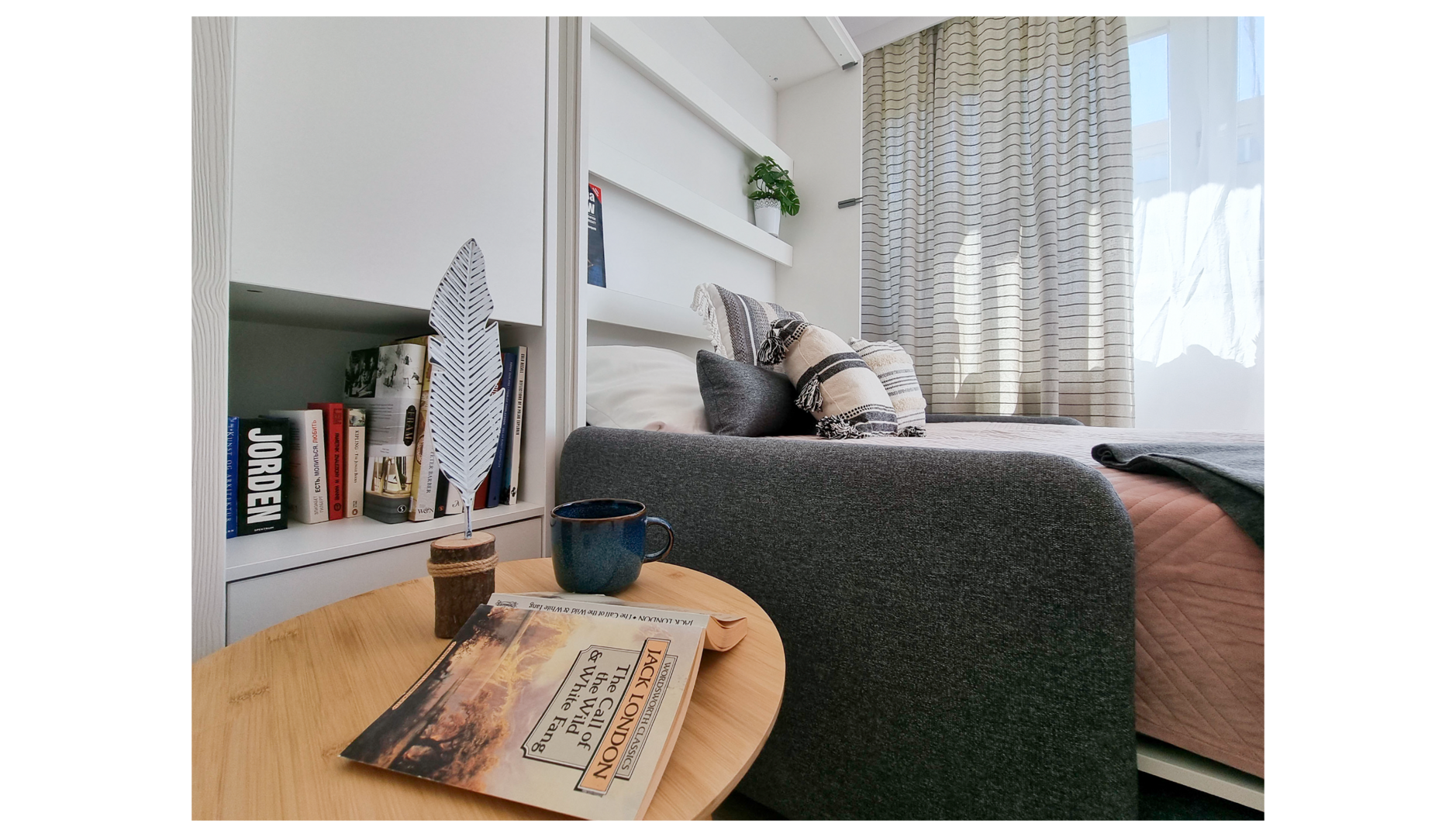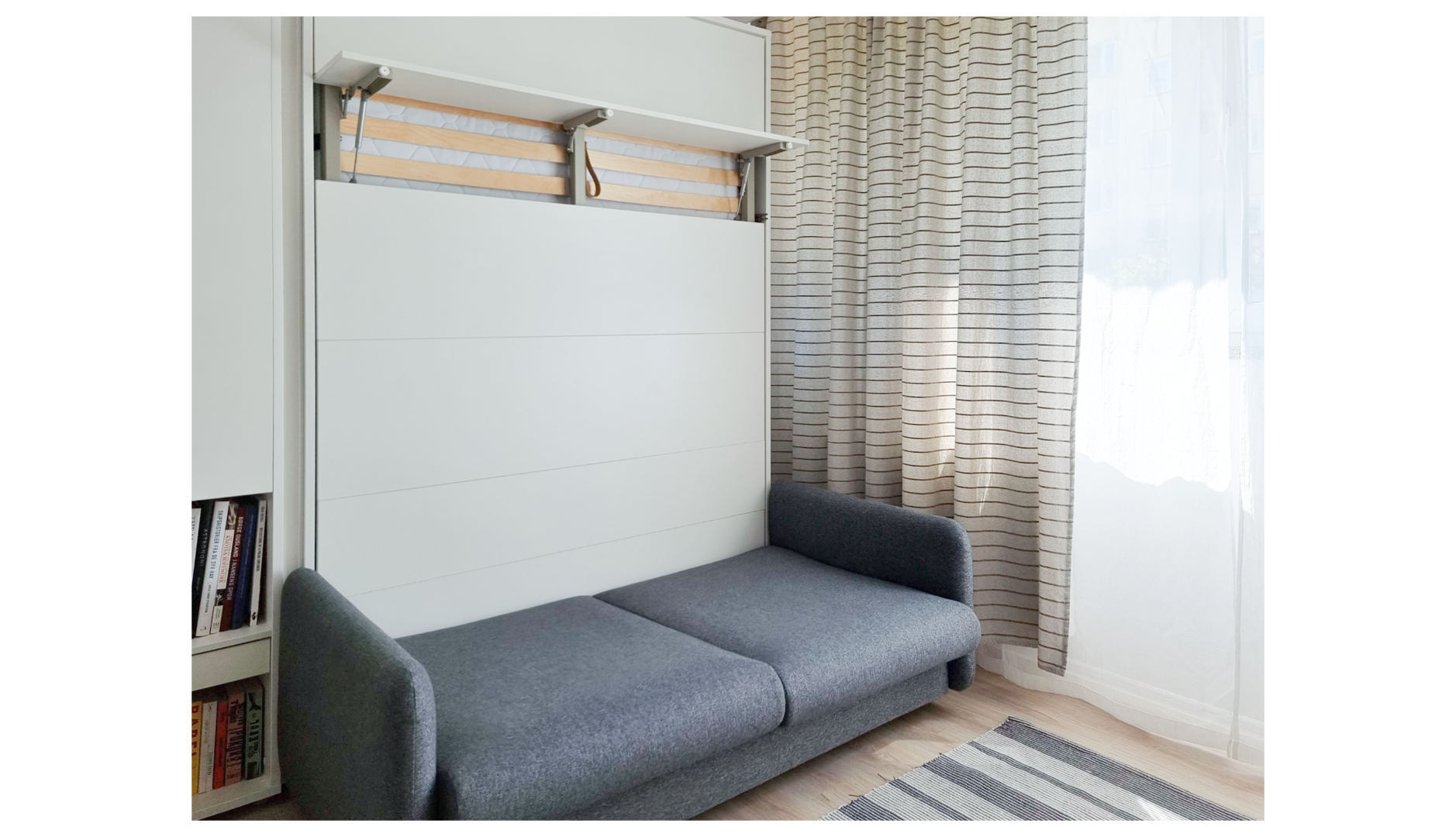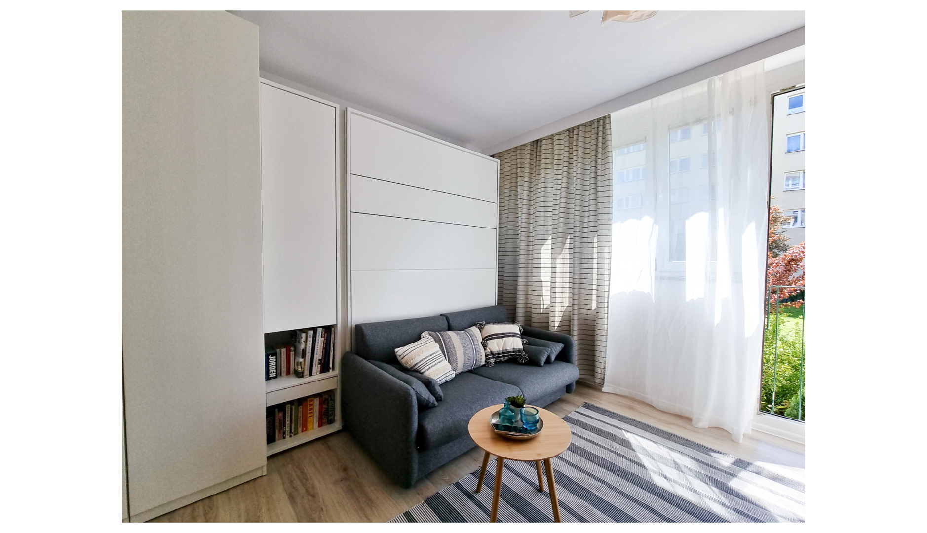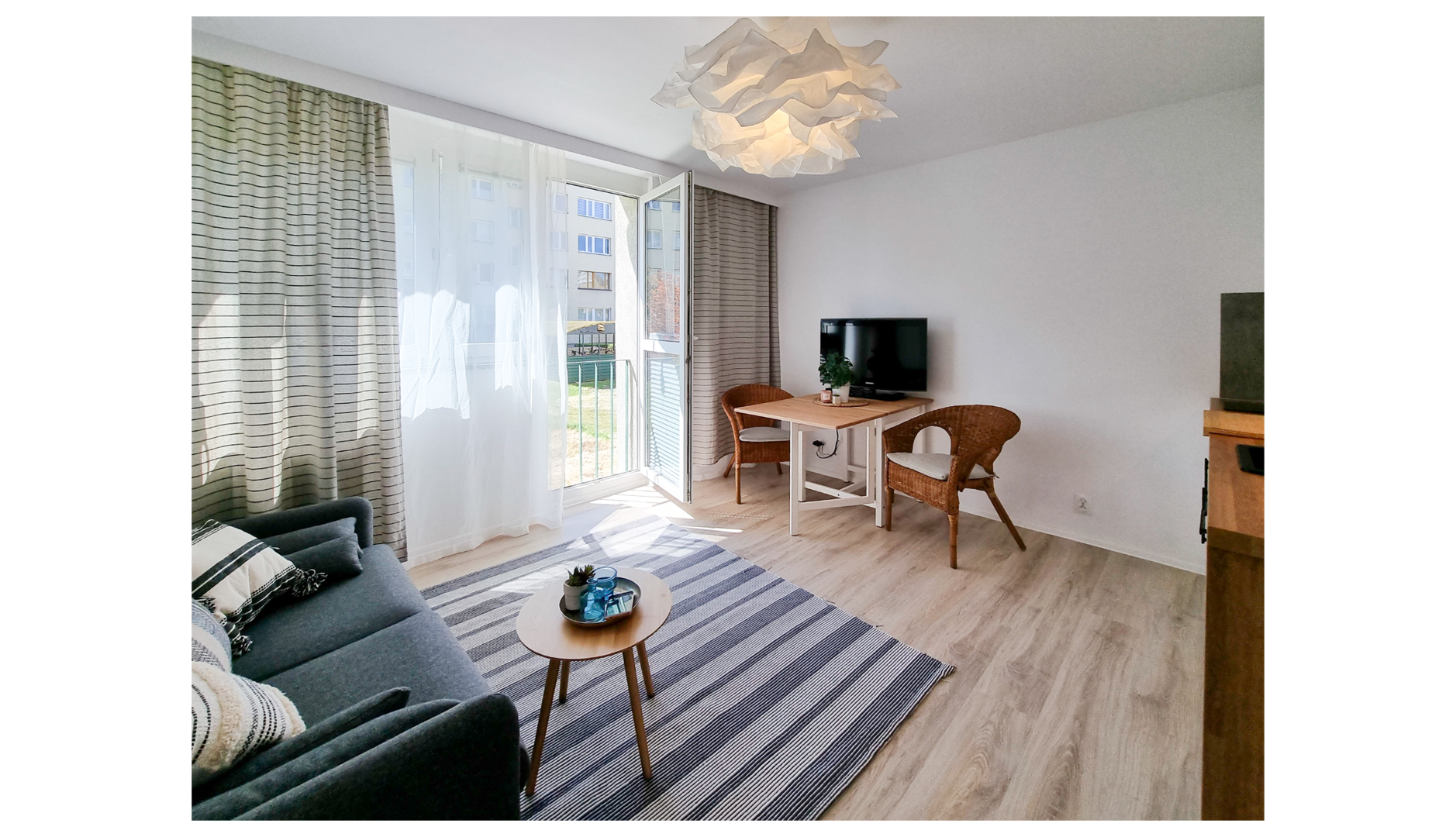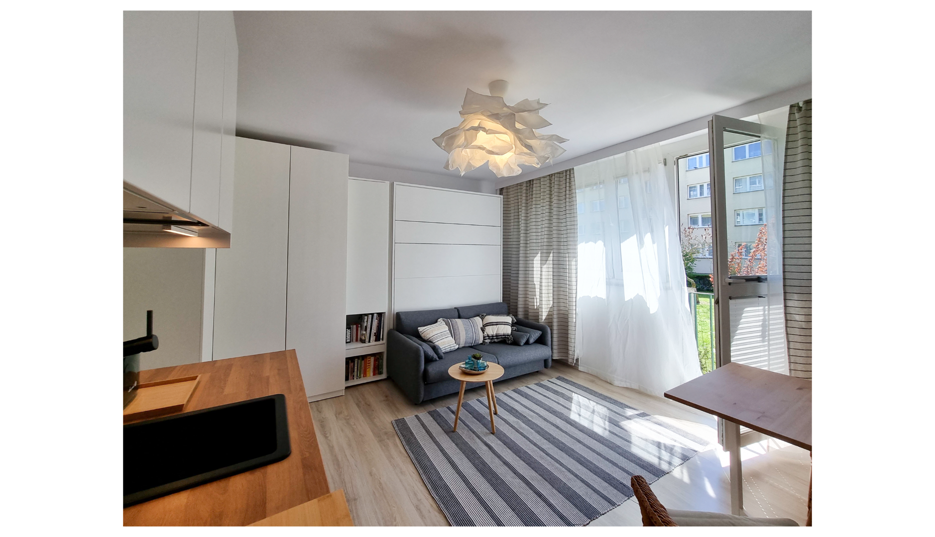 Modern furnished 2-room apartment with the area of 31m2 consists of a living room with sitting area and kitchenette and a bedroom. The windows and balcony of the apartment are facing north.