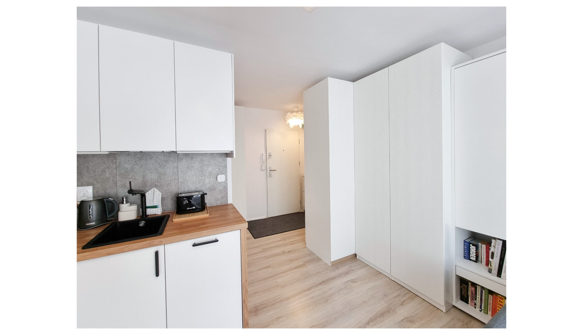 The 1-room flat with an area of 25m2 was prepared for the stay of 2 people. It consists of a room with a kitchenette and a balcony, an entrance hall and a bathroom.