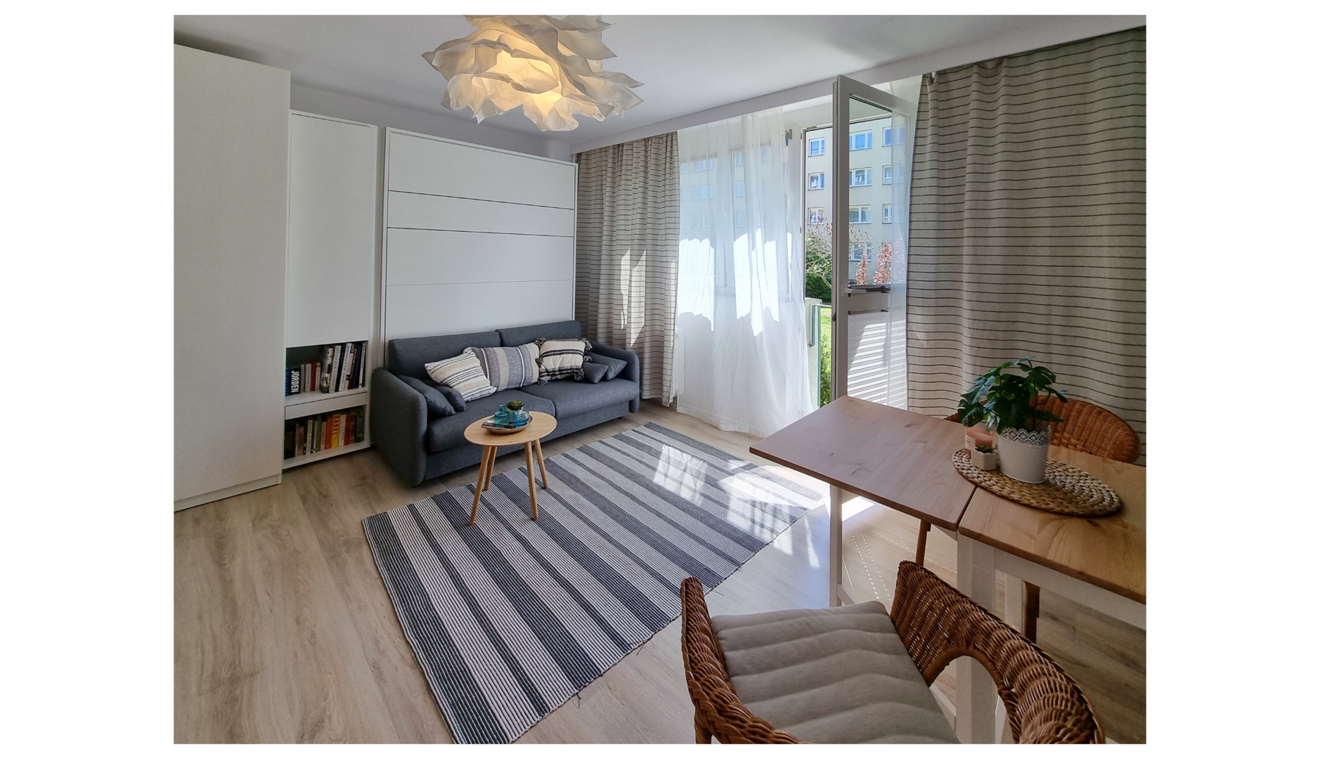 Studio Apartment with a balcony prepared for a stay of 3 people. It is located within the enclosed residential area "Zacisze Leśne," situated in the western, quiet part of Świnoujście, by the edge of the forest and near the beach.