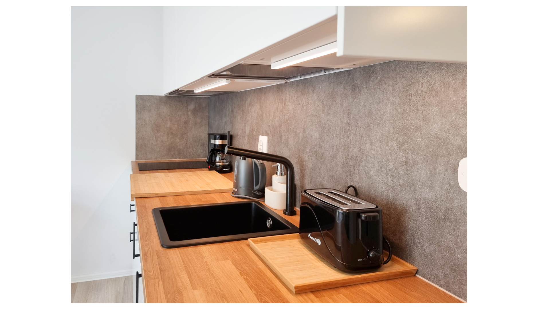 Exclusive one-room flat on the first floor. It consists of a living room with a kitchenette and a bathroom. The flat is furnished with a comfortable bed, an armchair, a table and two chairs and a dressing table. The kitchenette is equipped with a two-burn