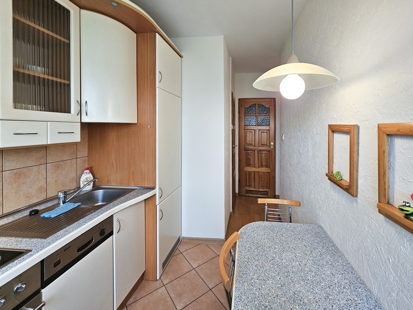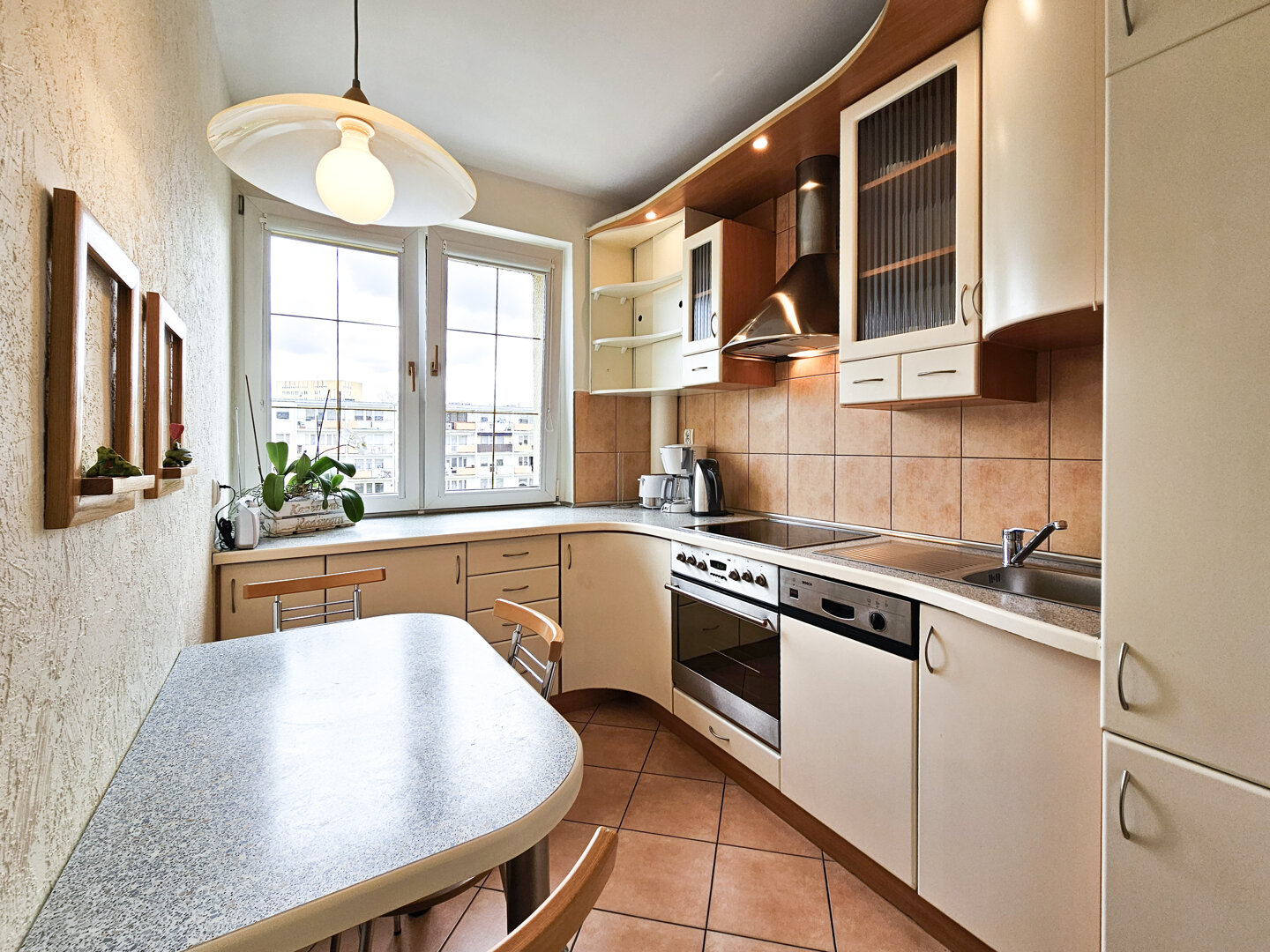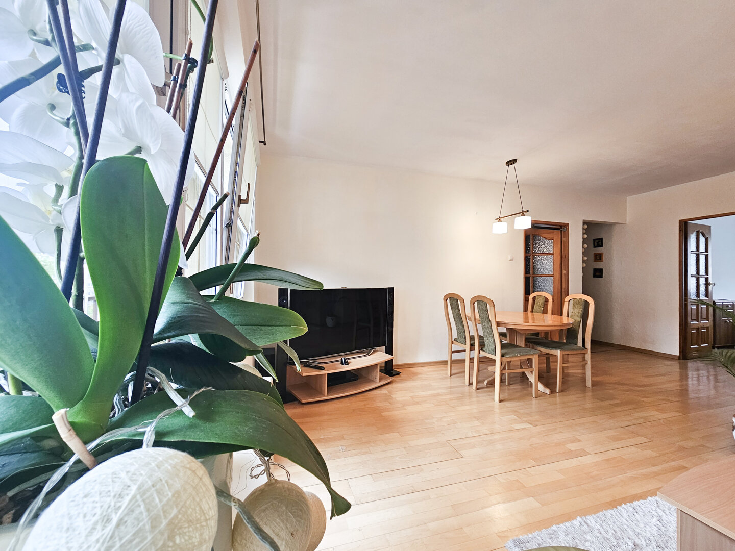 Stylish 80m² apartment on the second floor of a building without an elevator. Spacious living room with kitchenette and access to the south-facing balcony.