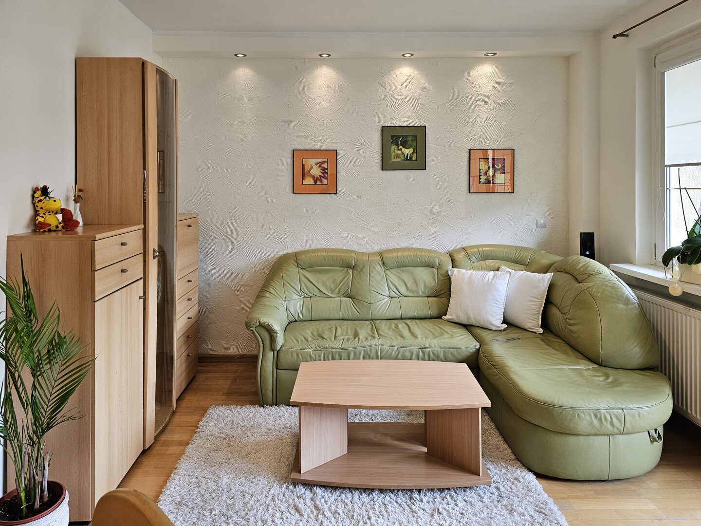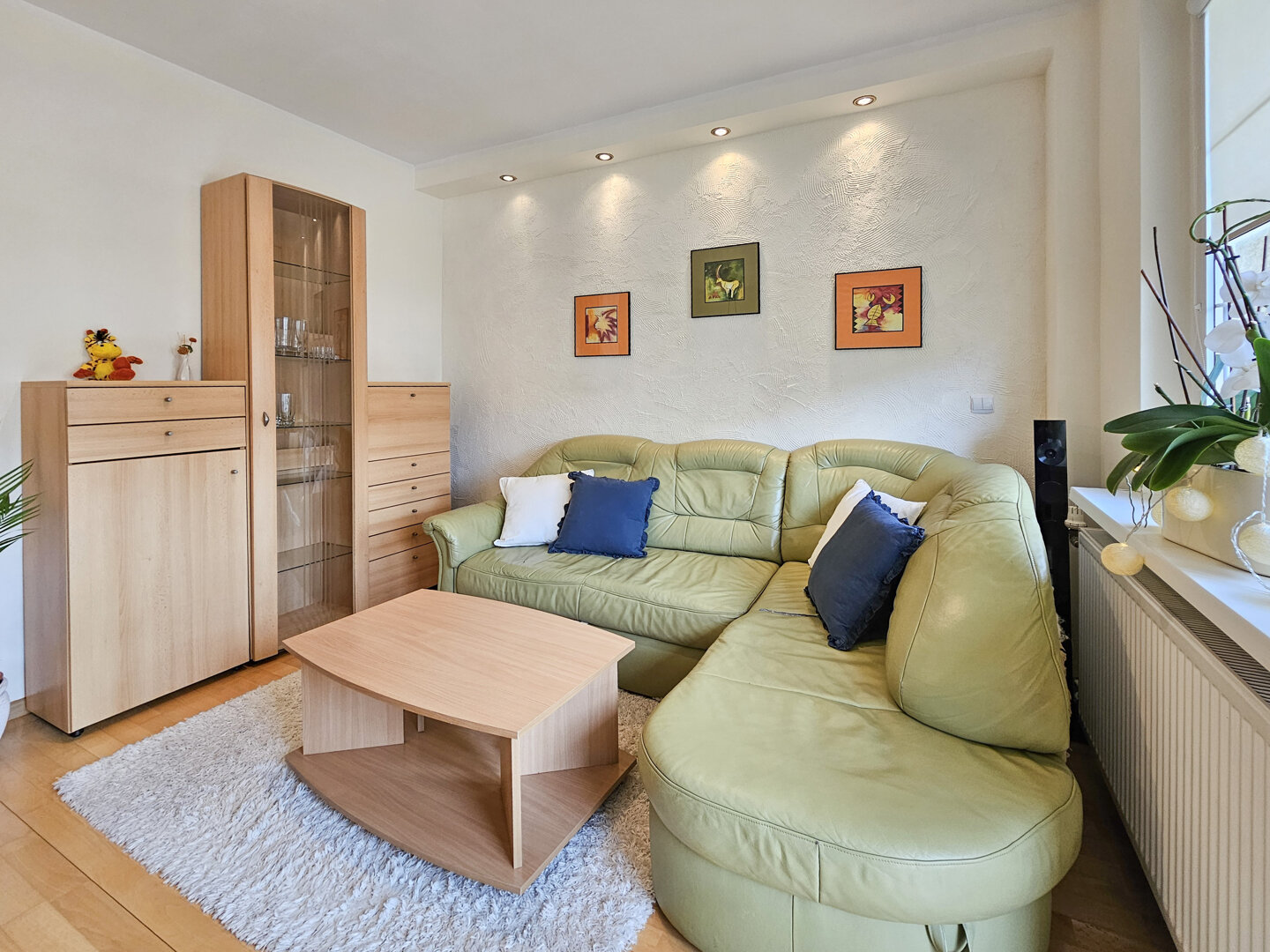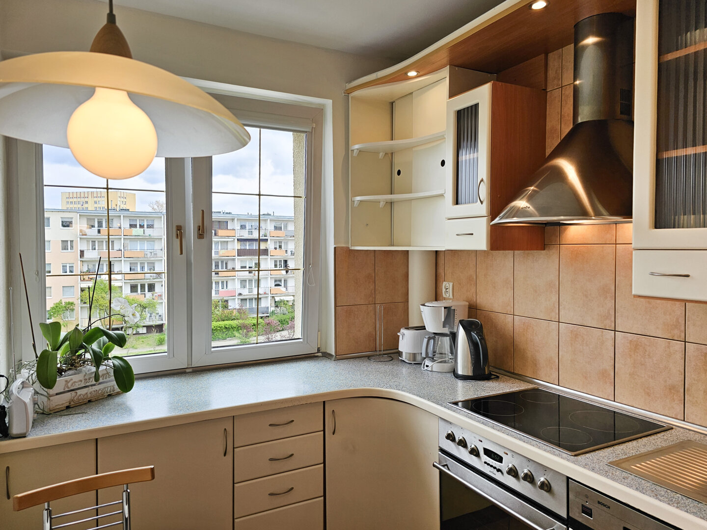Stylish 80m² apartment on the second floor of a building without an elevator. Spacious living room with kitchenette and access to the south-facing balcony.