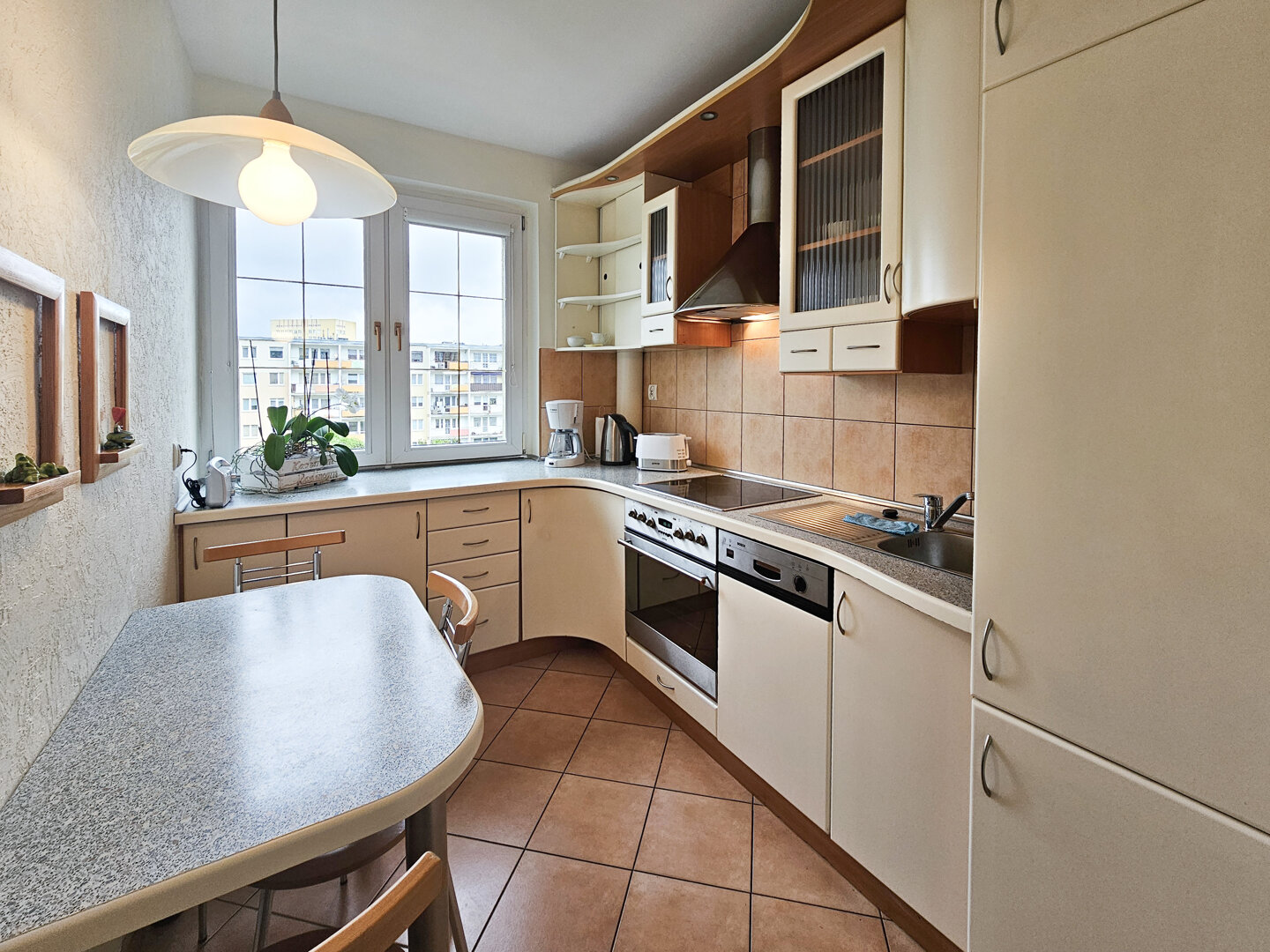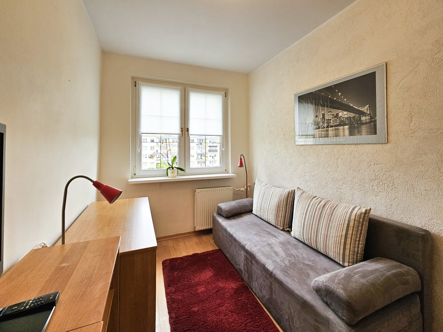 The living room with balcony is equipped with a sofa bed, coffee table and two armchairs. A TV with access to Vectra cable television programmes. The living room opens onto an east-facing balcony overlooking the green courtyard.