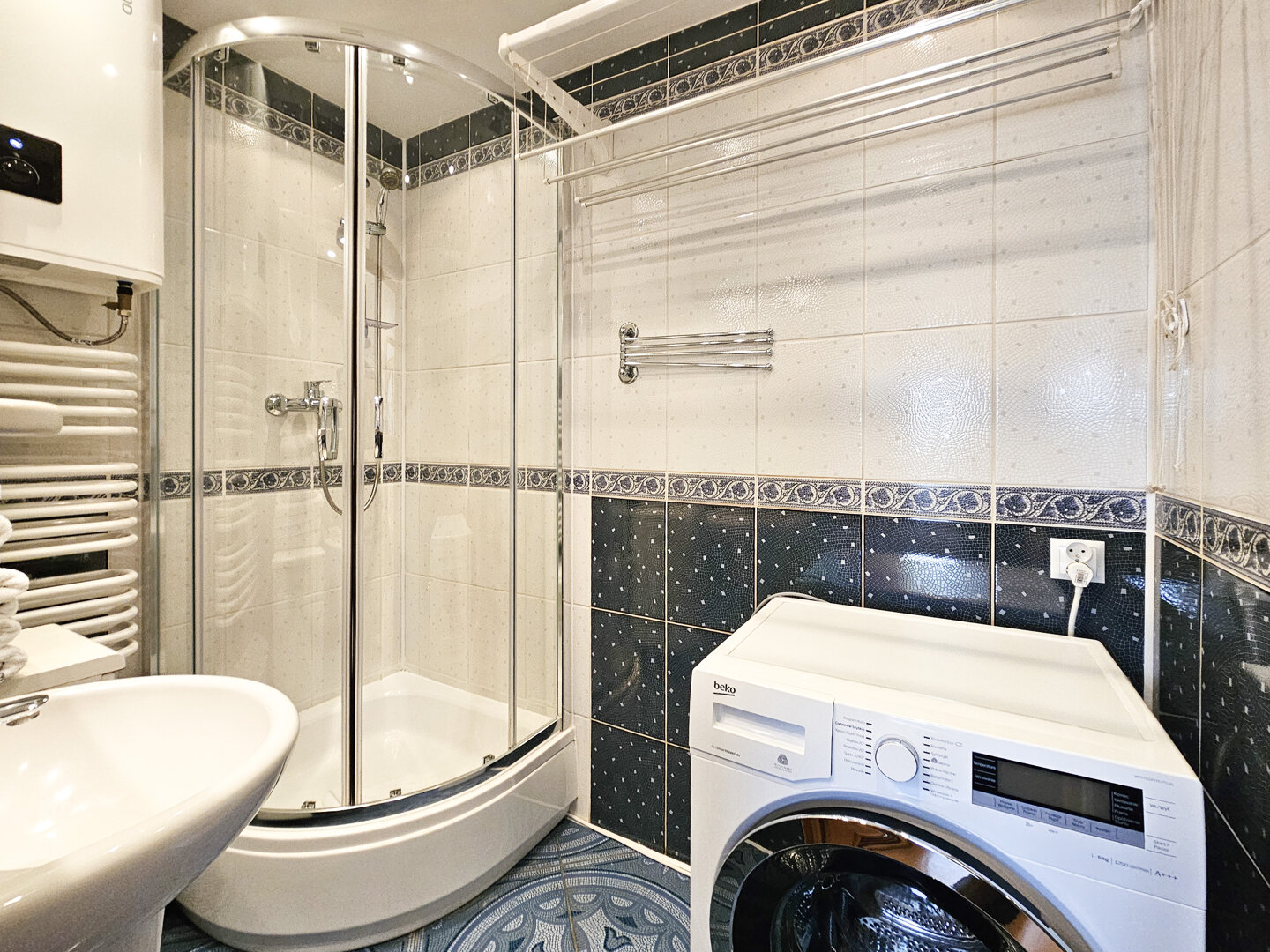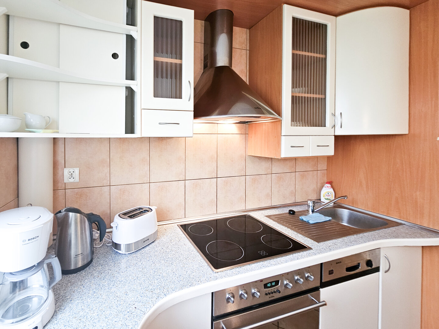It is located on the 3rd floor of a 4-story building without an elevator. Bedroom 1 is furnished with a double bed (160x200 cm) and a large corner cabinet; the other two bedrooms feature fold-out sofas (sleeping area 140x200 cm). Living room with sofa, coffee table, and dining table, plus access to the balcony. The apartment’s kitchen is very well equipped. Guests have access to a dishwasher, an oven, a 4-burner electric stove, and a large refrigerator with a freezer compartment. The bathroom features a shower, sink, and automatic washing machine. The bathroom also has an electric water heater. The apartment has a separate toilet. Guests have access to 3 TVs and Wi-Fi.