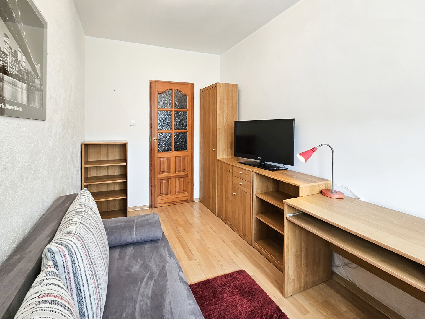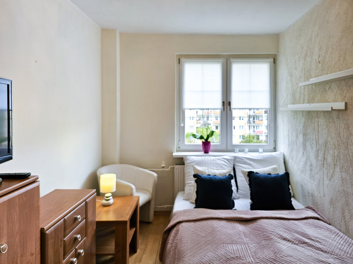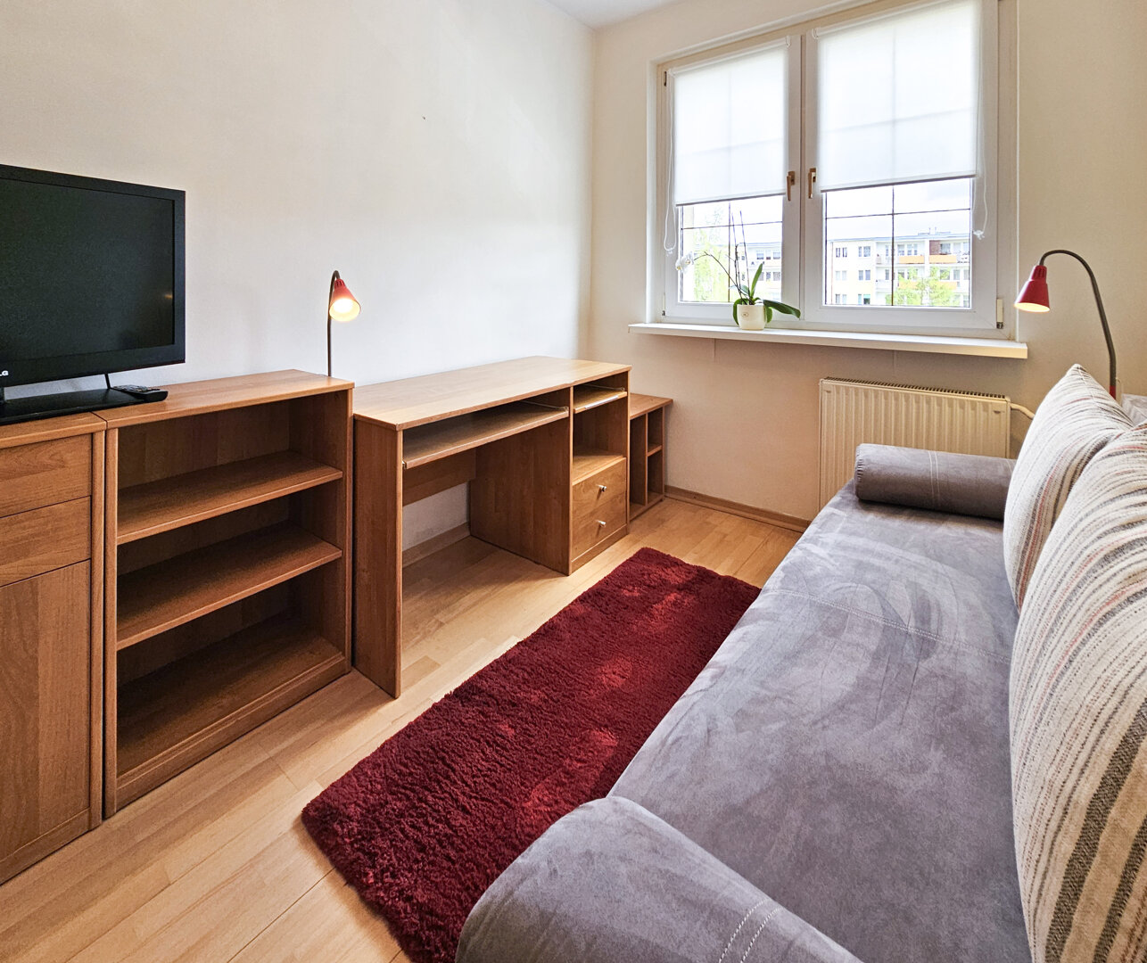 One-room apartment (26m2), designed for 2 people, located on the high ground floor of a four-story building. The room has a double sofa bed, dining table, chest of drawers, and flat-screen TV.