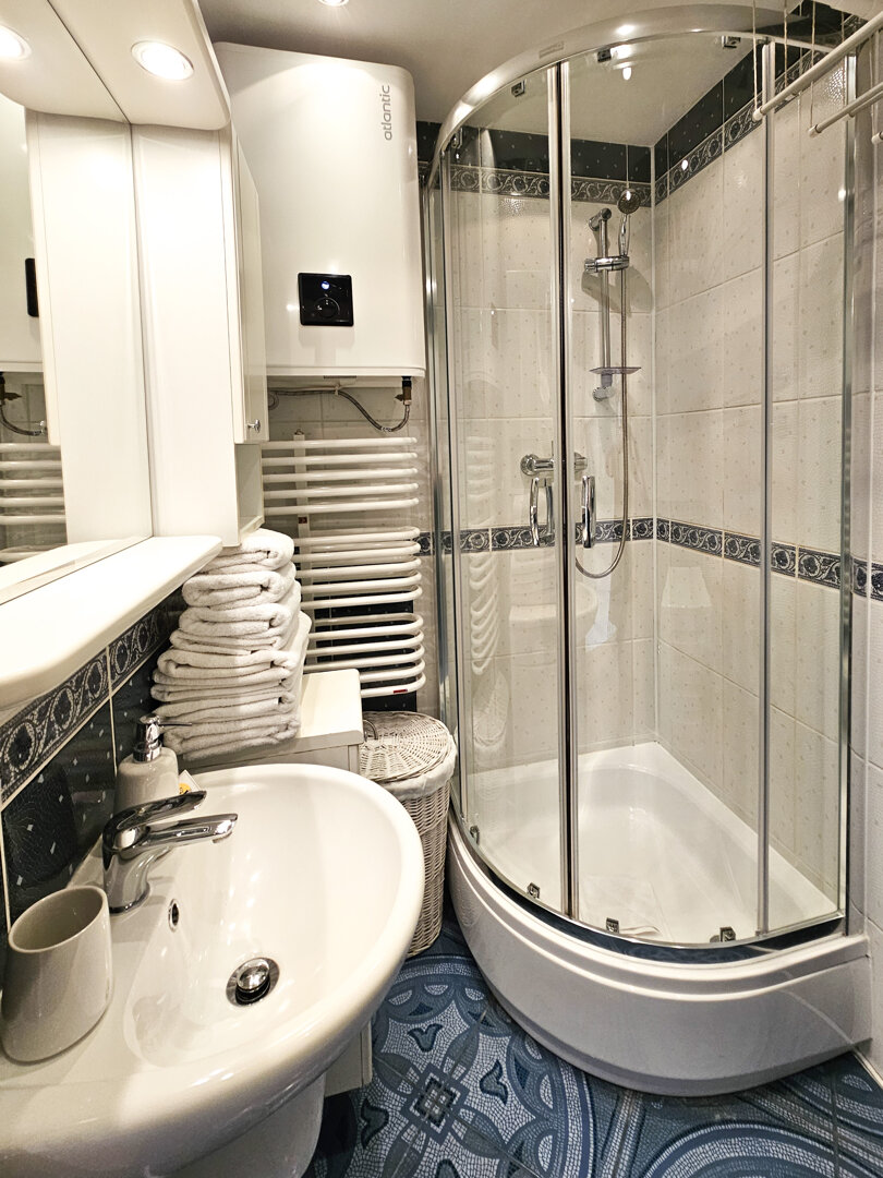 A stylish apartment in a historic early-20th-century building, located on the 4th floor (stairs only). It features a bright living room with a fold-out sofa and smart TV, a spacious bedroom with a double bed, a separate kitchen, and a bathroom with a show