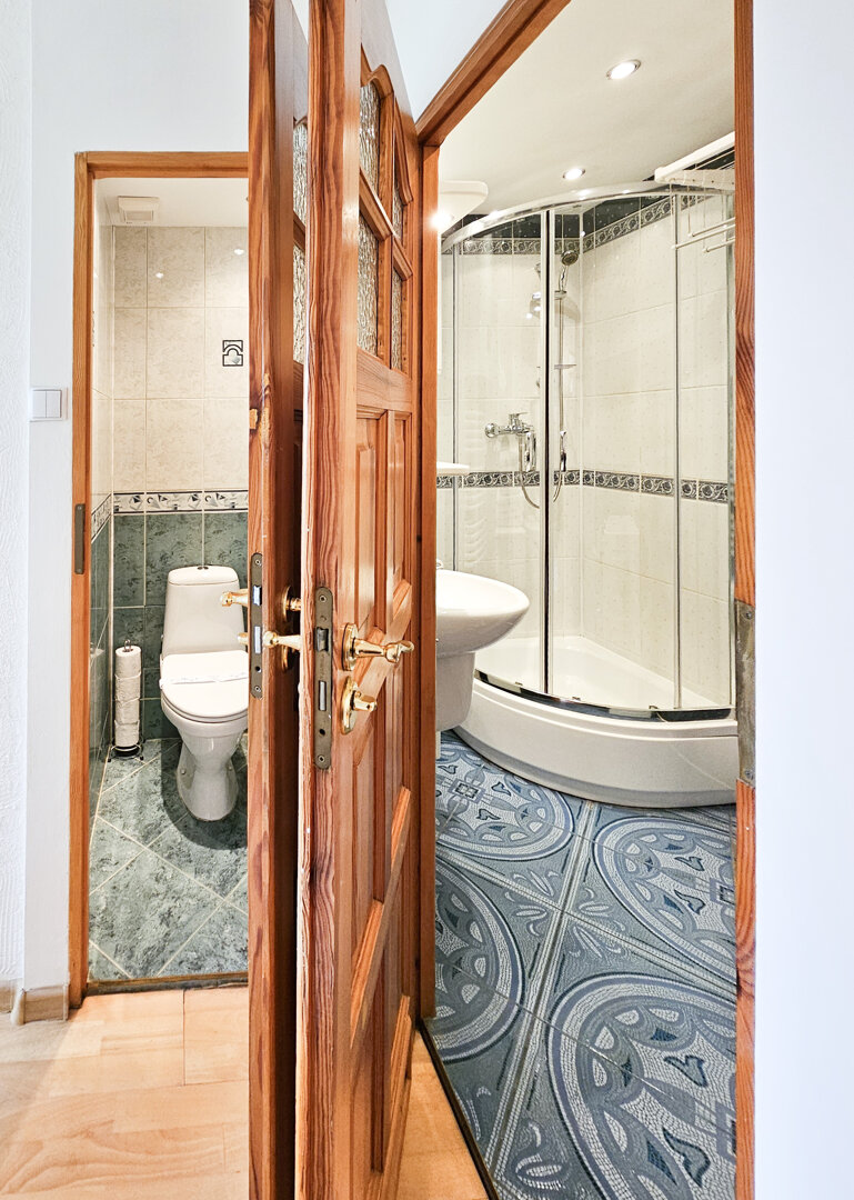 Exclusive one-room flat on the first floor. It consists of a living room with a kitchenette and a bathroom. The flat is furnished with a comfortable bed, an armchair, a table and two chairs and a dressing table. The kitchenette is equipped with a two-burn