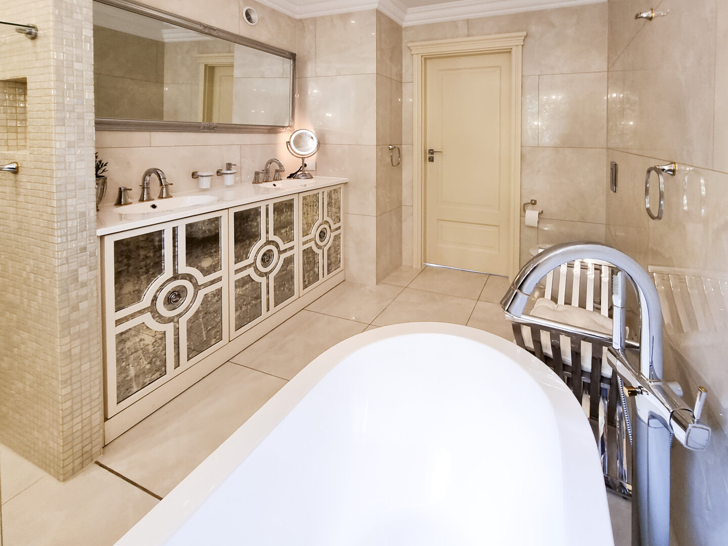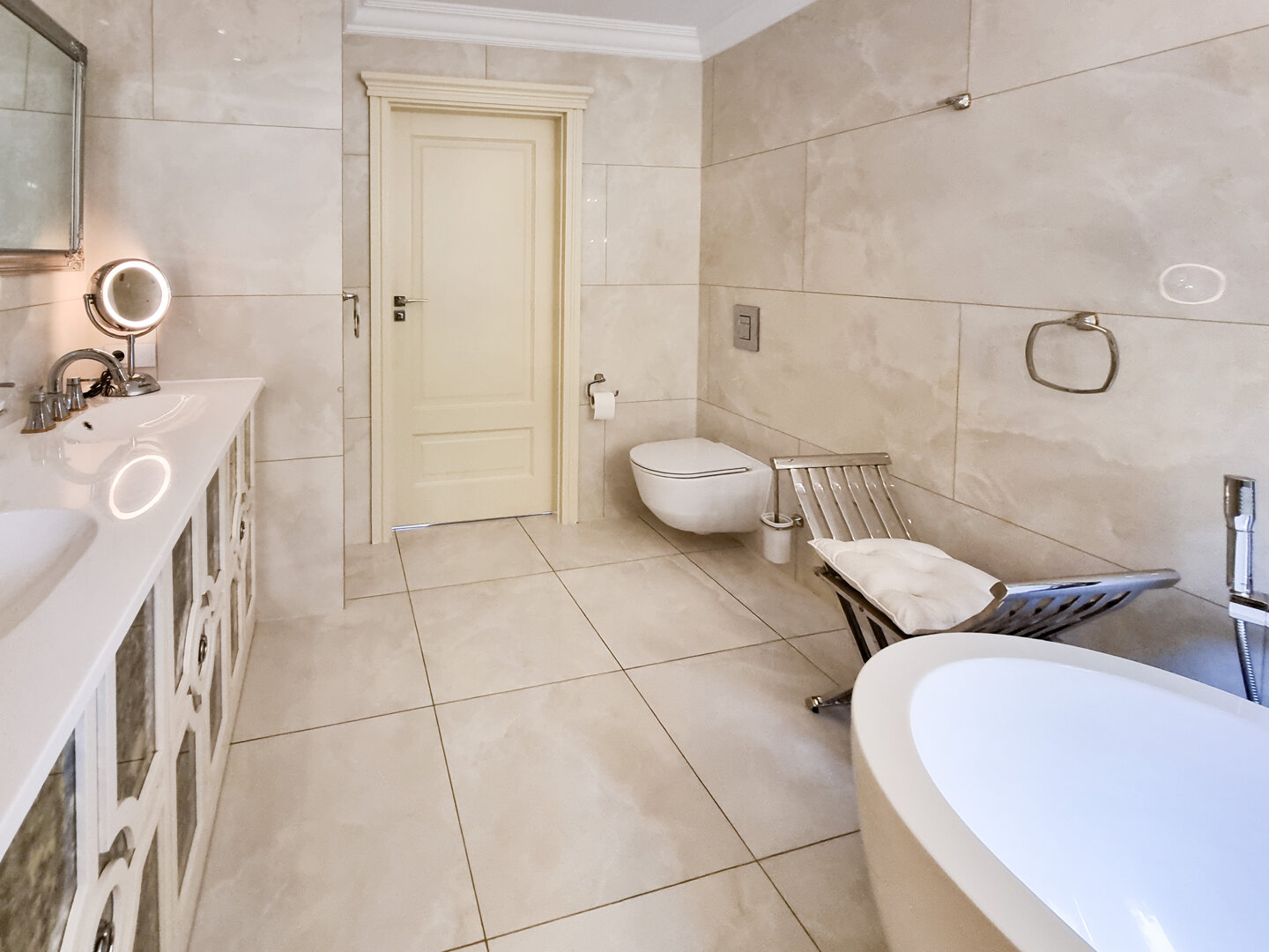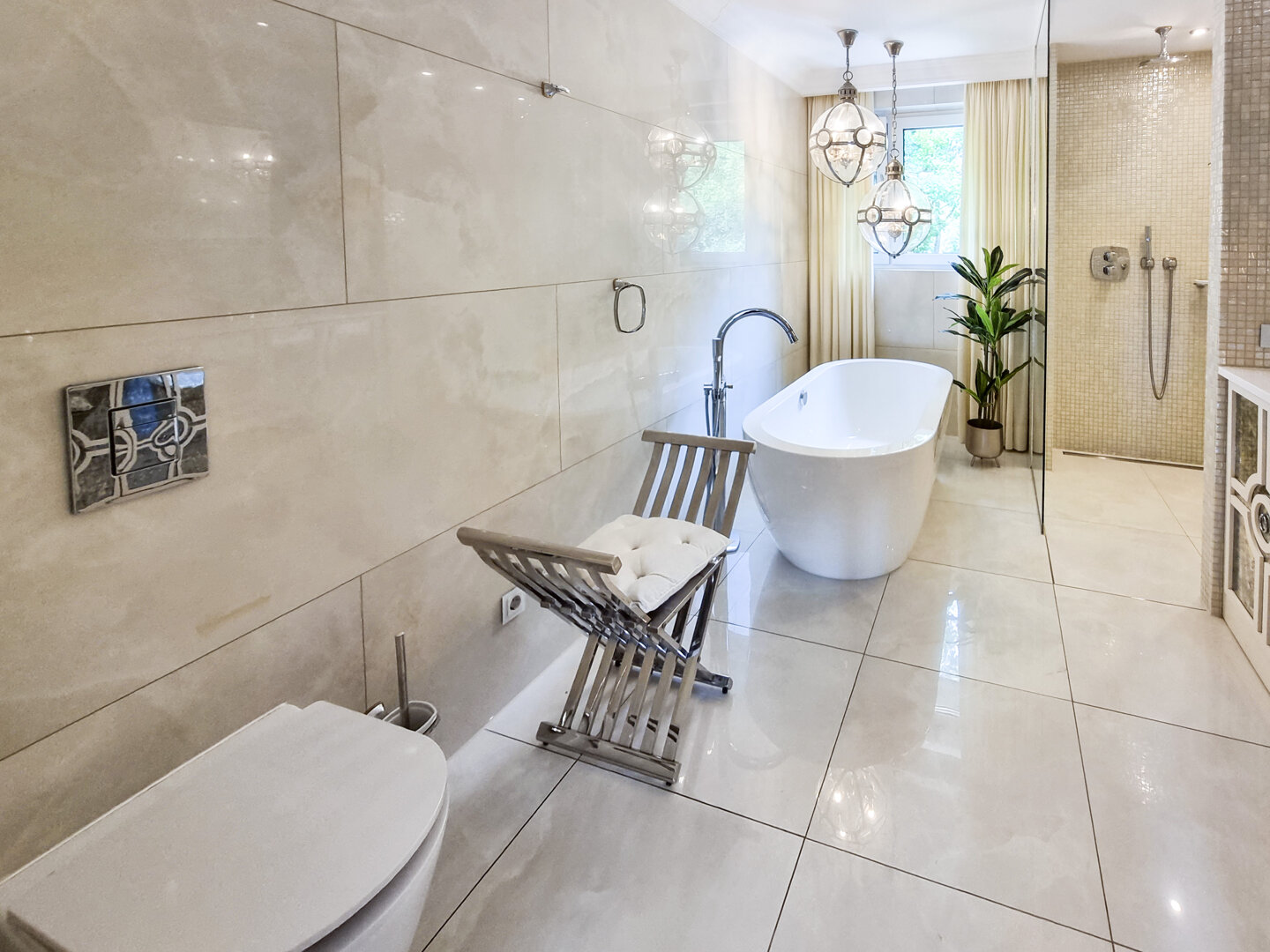 Duża łazienka z wanną, prysznicem i toaletą.
