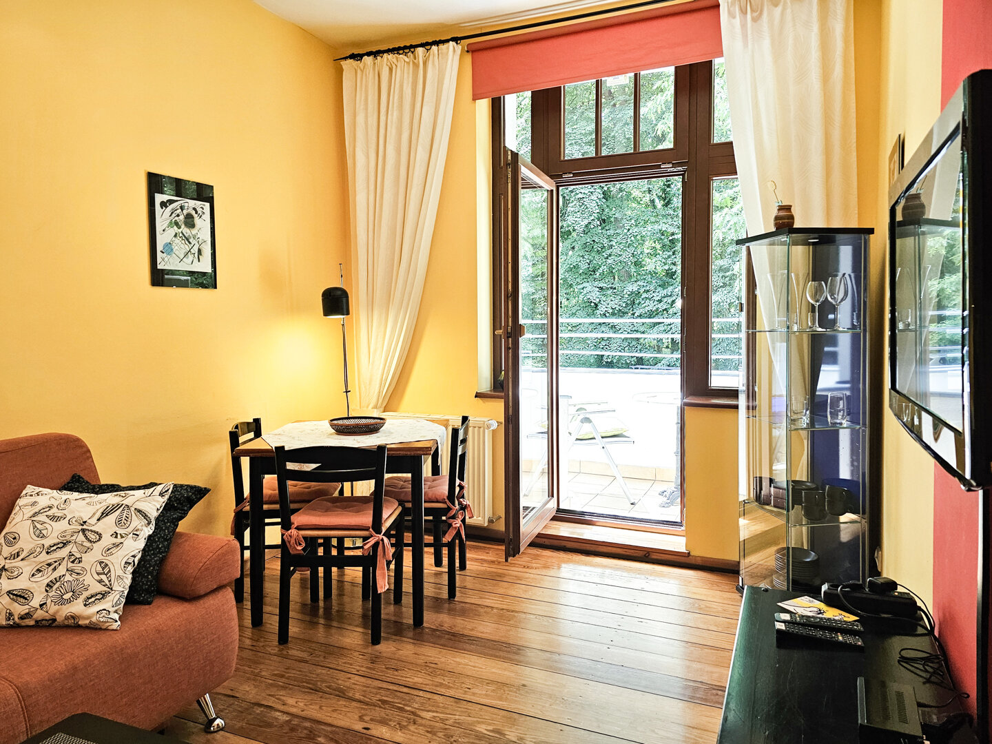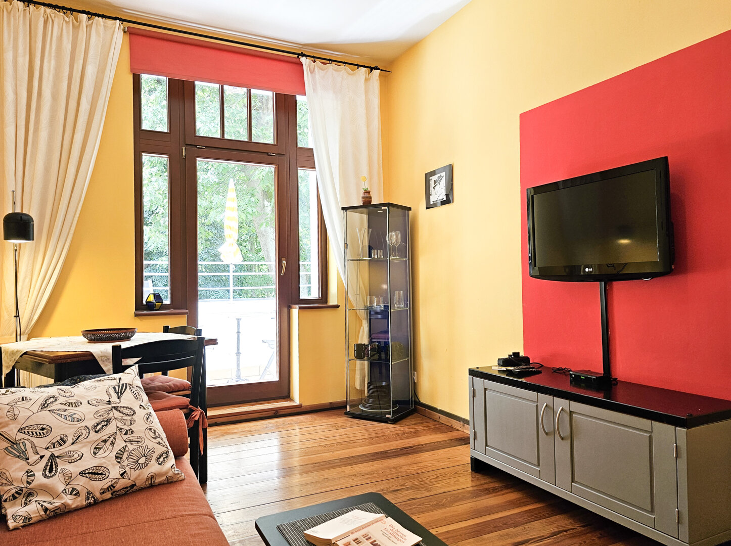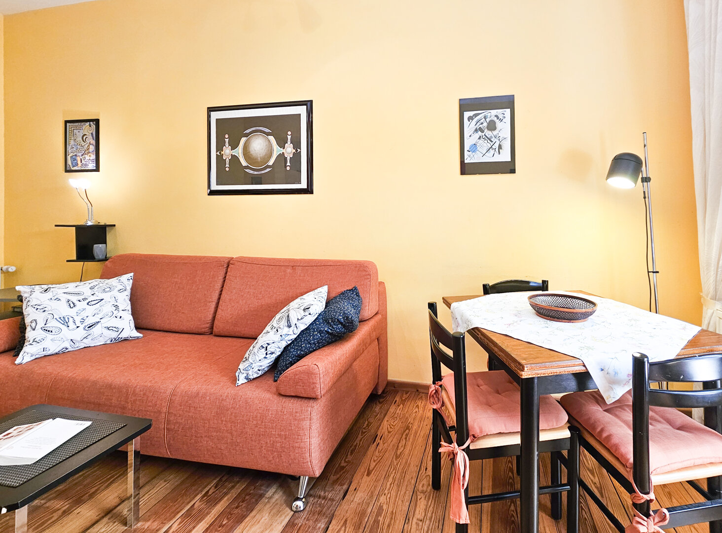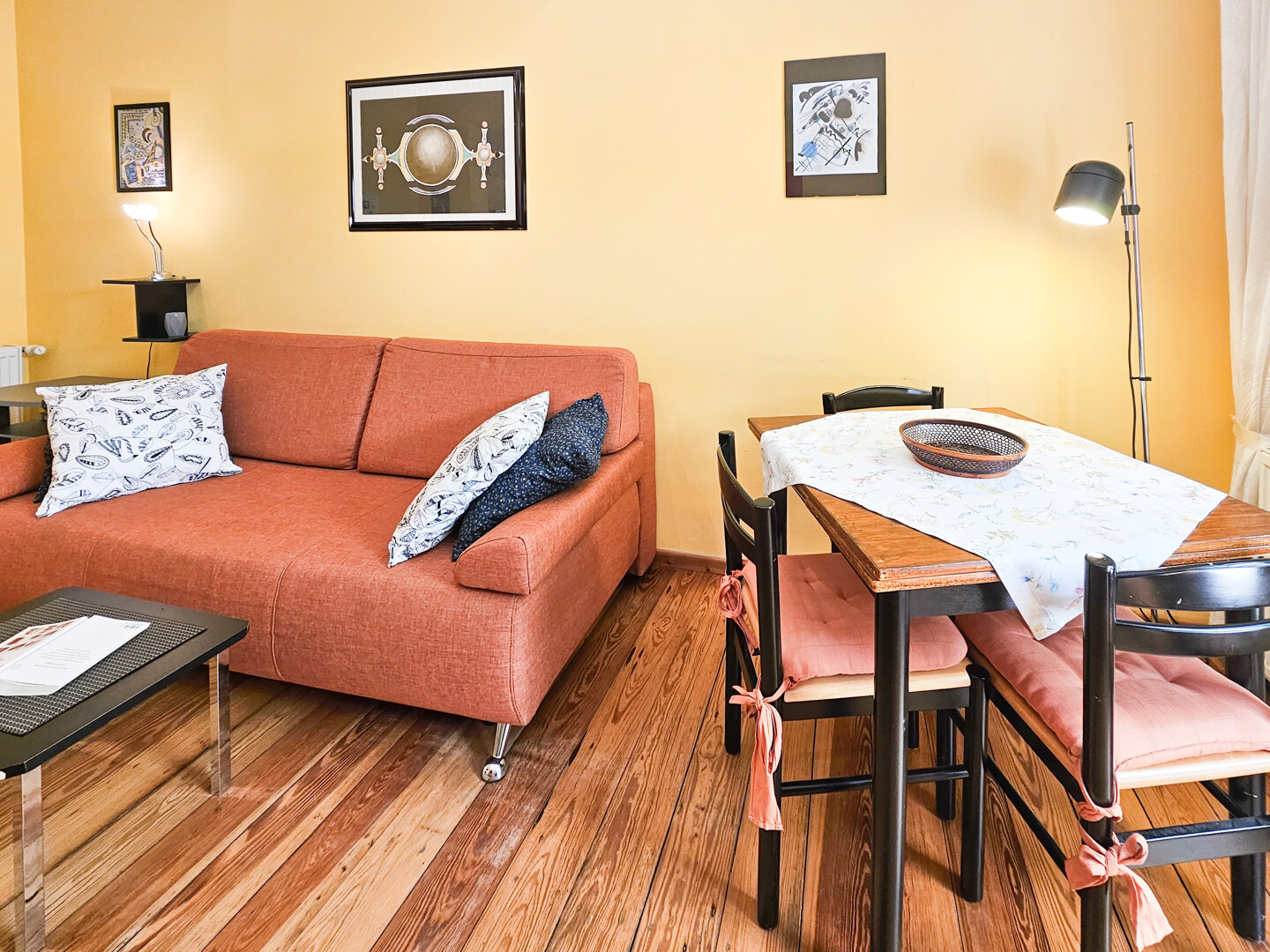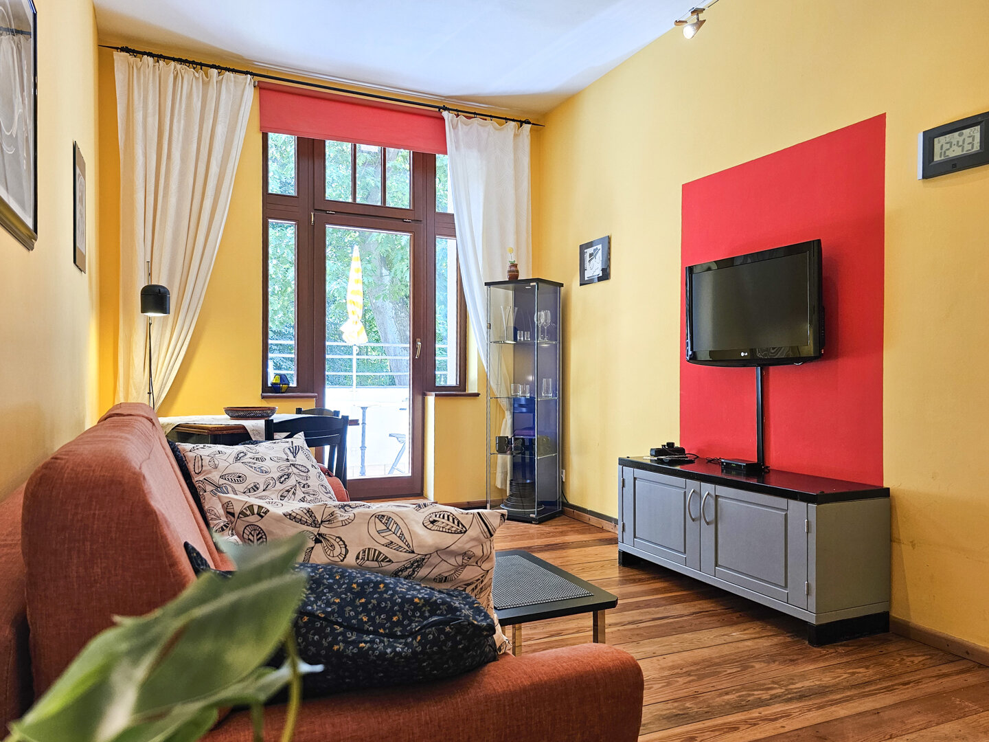 Jednopokojowy apartament (26m2), przygotowany do pobytu  2 osób, znajdujący się na wysokim parterze czterokondygnacyjnego budynku. W pokoju znajduje się rozkładana dwuosobowa kanapa, stół jadalniany, komoda, telewizor z płaskim ekranem. Z pokoju wyjść można na balkon. Okna apartamentu i balkon skierowane są na południe. Na balkonie znajduje się stolik i krzesełka. Aneks kuchenny jest wyposażony podstawowy sprzęt kuchenny. Łazienka z kabiną prysznicową. Za dodatkową opłatą istnieje możliwość wynajęcia jednego miejsca parkingowego na terenie posesji.Internet bezprzewodowy jest dostępny.
