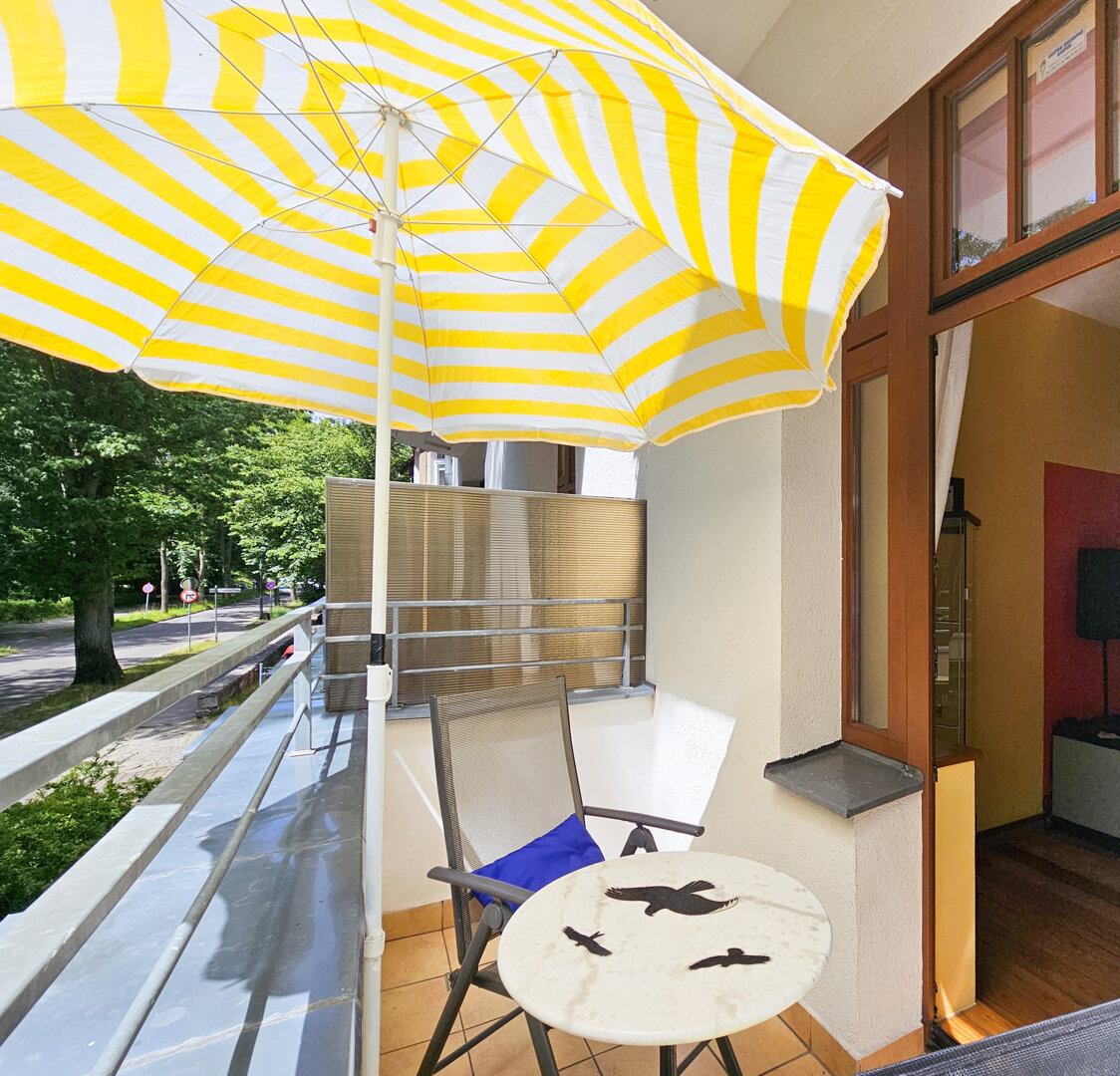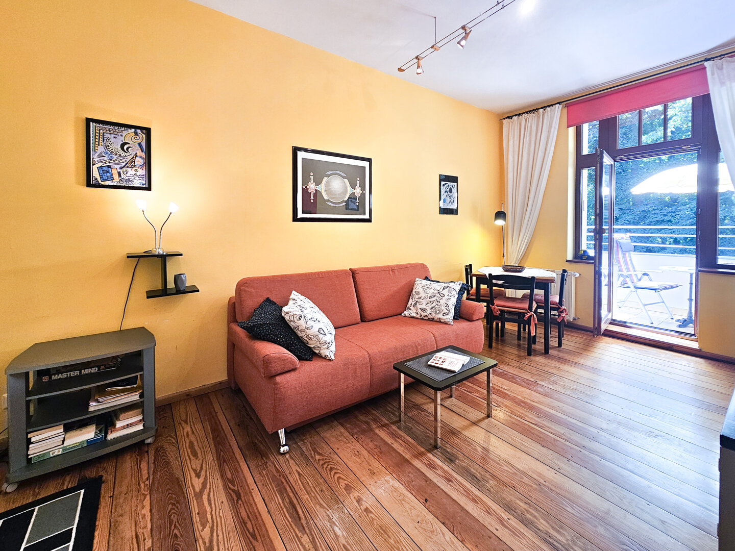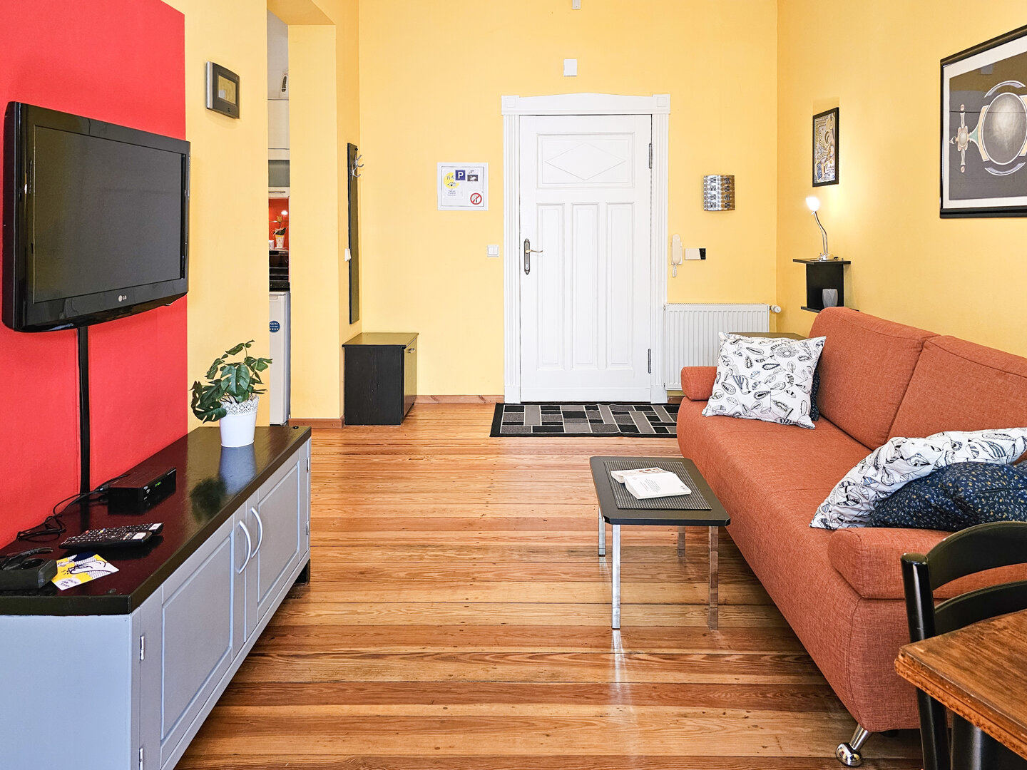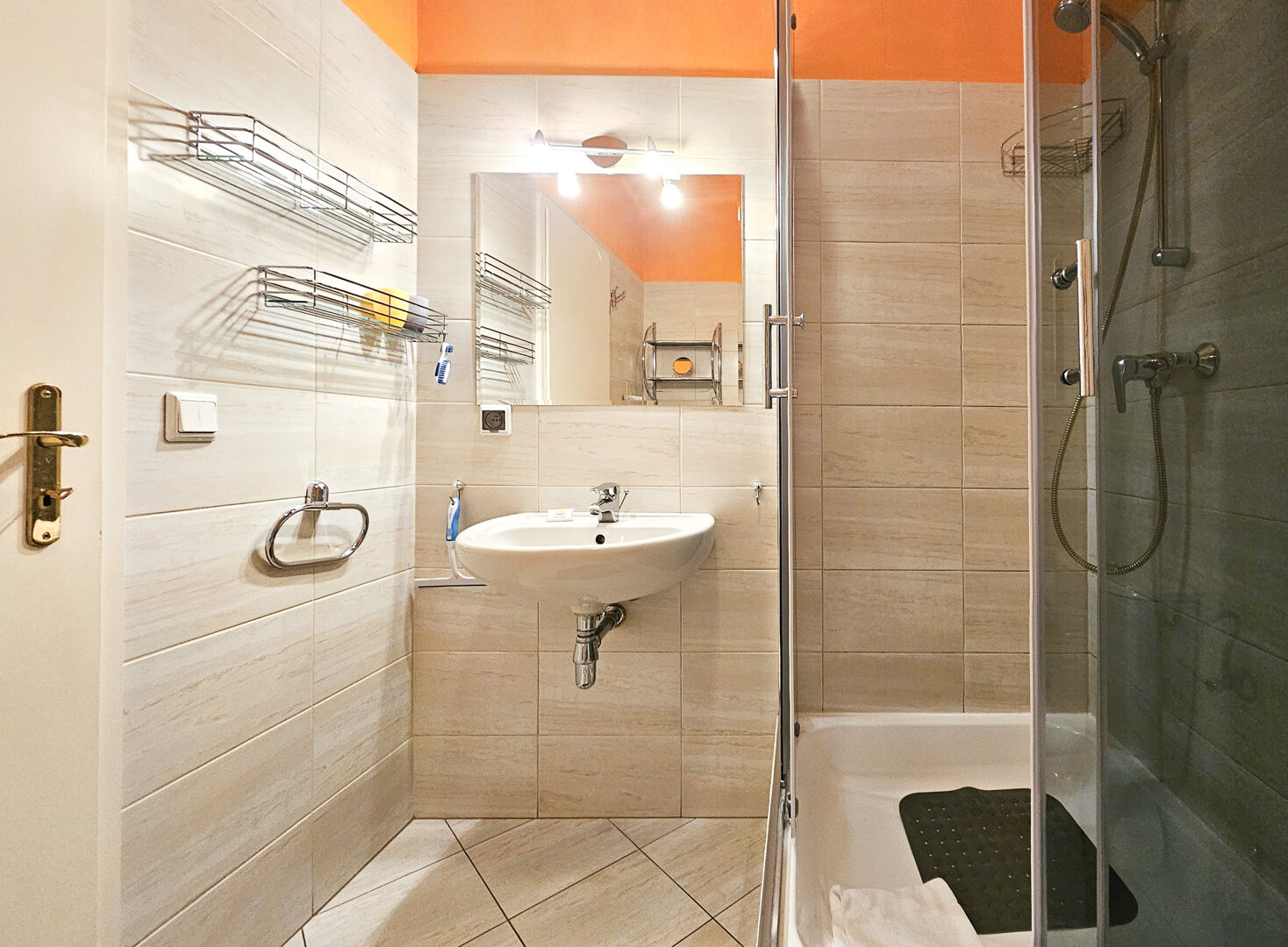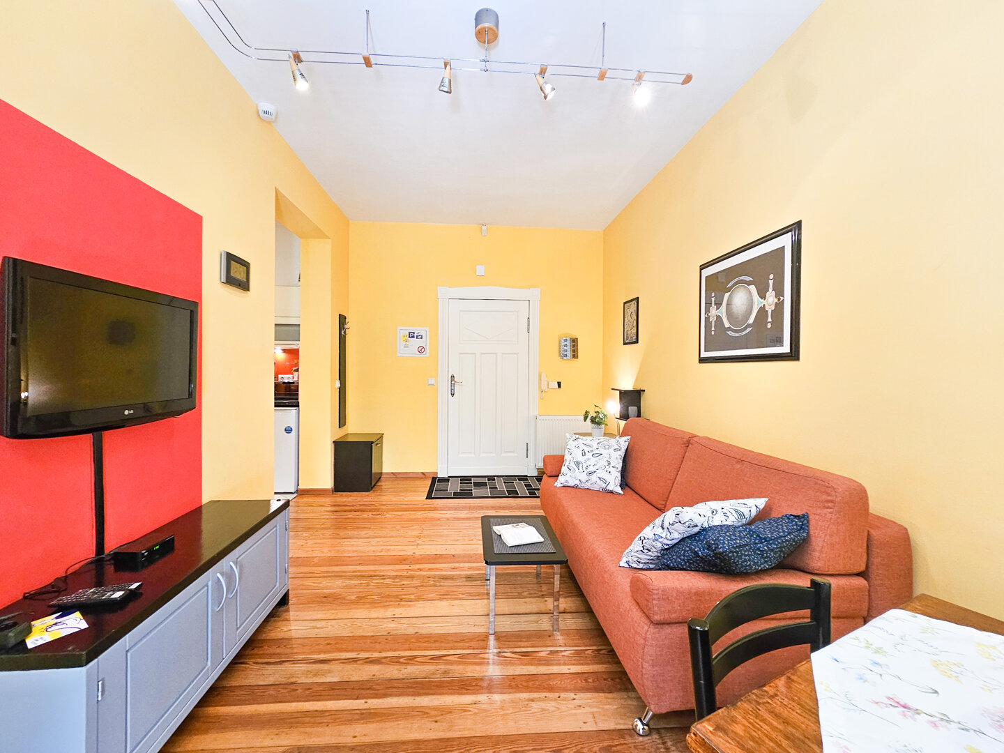 Jednopokojowy apartament (26m2), przygotowany do pobytu  2 osób, znajdujący się na wysokim parterze czterokondygnacyjnego budynku. W pokoju znajduje się rozkładana dwuosobowa kanapa, stół jadalniany, komoda, telewizor z płaskim ekranem. Z pokoju wyjść można na balkon. Okna apartamentu i balkon skierowane są na południe. Na balkonie znajduje się stolik i krzesełka. Aneks kuchenny jest wyposażony podstawowy sprzęt kuchenny. Łazienka z kabiną prysznicową. Za dodatkową opłatą istnieje możliwość wynajęcia jednego miejsca parkingowego na terenie posesji.Internet bezprzewodowy jest dostępny.
